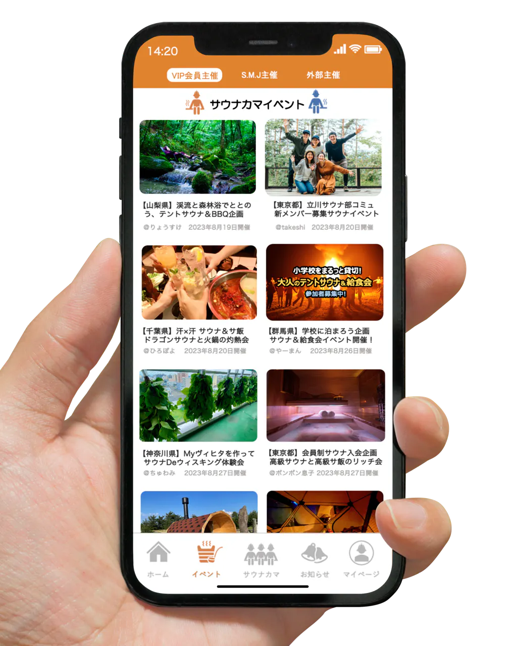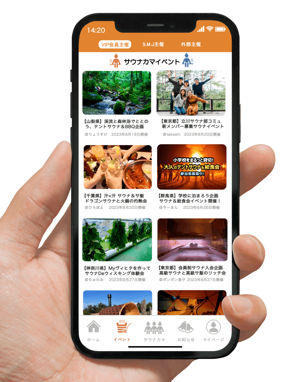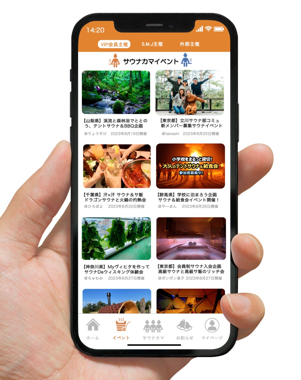 サウナカマイベントページでは、S.M.JAPAN運営主催と一般に周知されている外部主催のほか、サウナカマVIP会員はご自身が主催者となってイベントを立ち上げることが可能となり、イベントページにて告知することもできます。