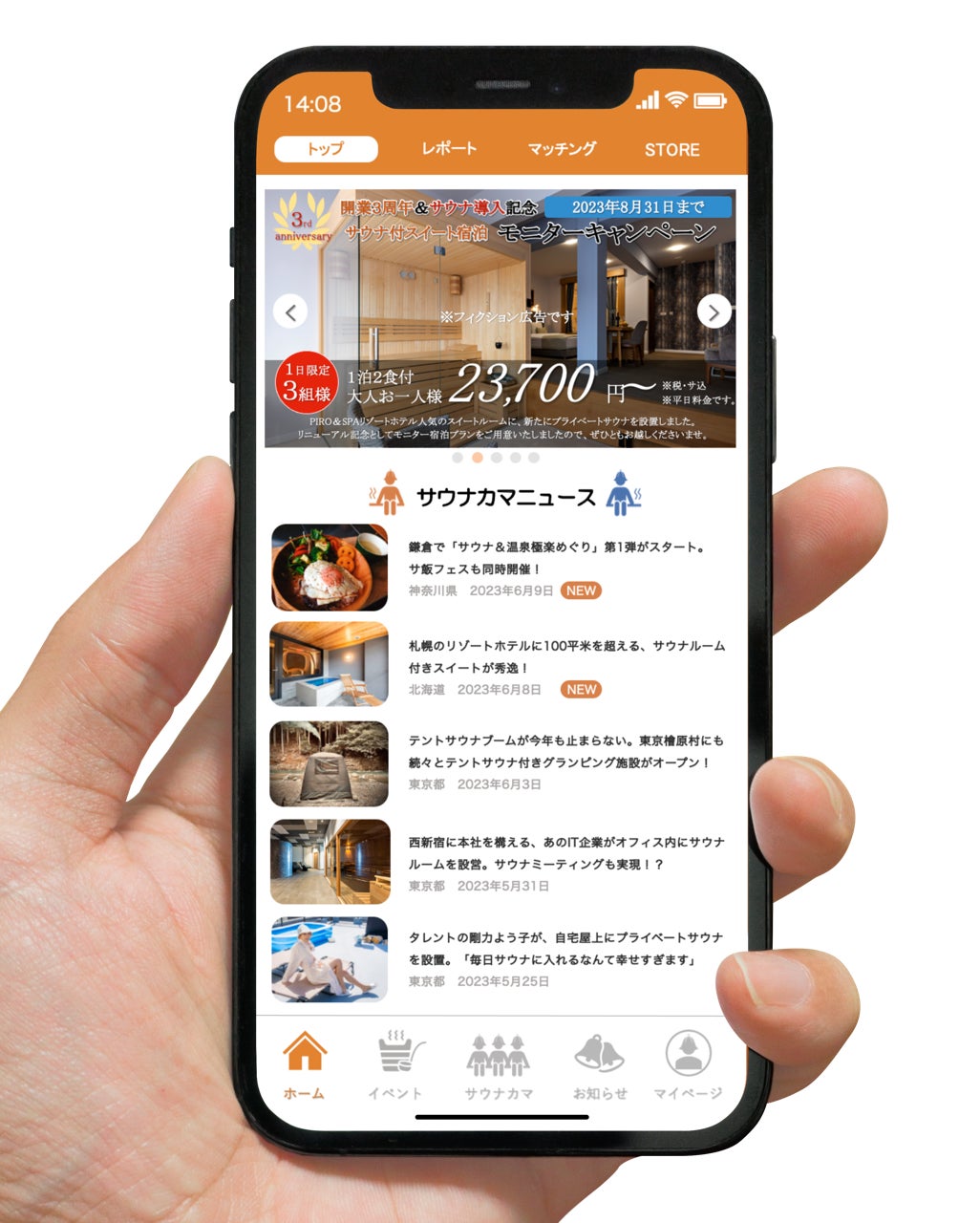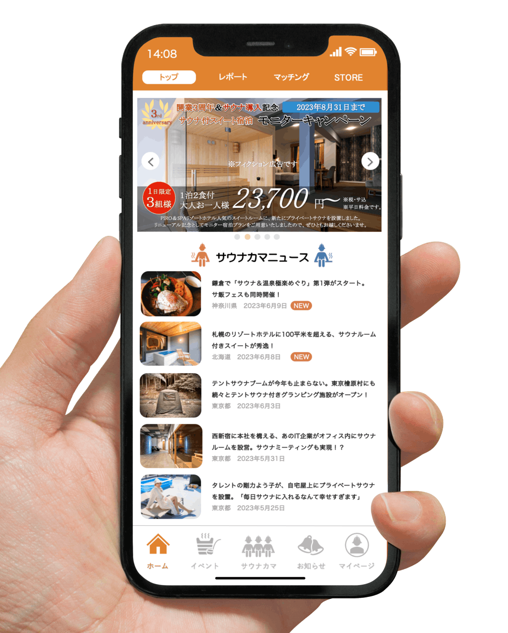 サウナカマアプリのTOPページでは、サウナに関連する最新ニュースや、注目のサウナ施設、注目のサ飯、注目のサウナ付き宿泊施設なども紹介していきます。