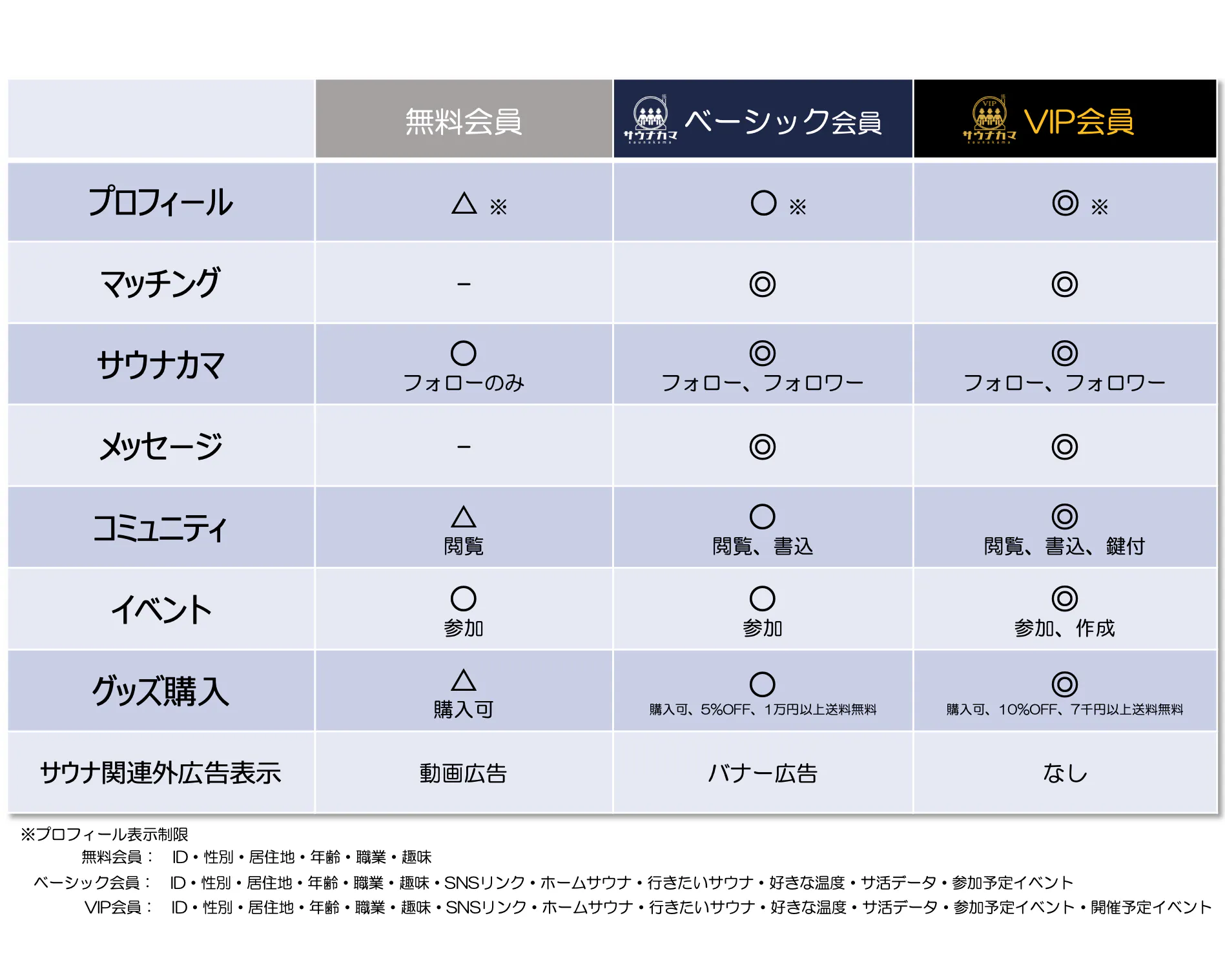 無料会員・ベーシック会員・VIP会員それぞれの違いは以下の通りです。