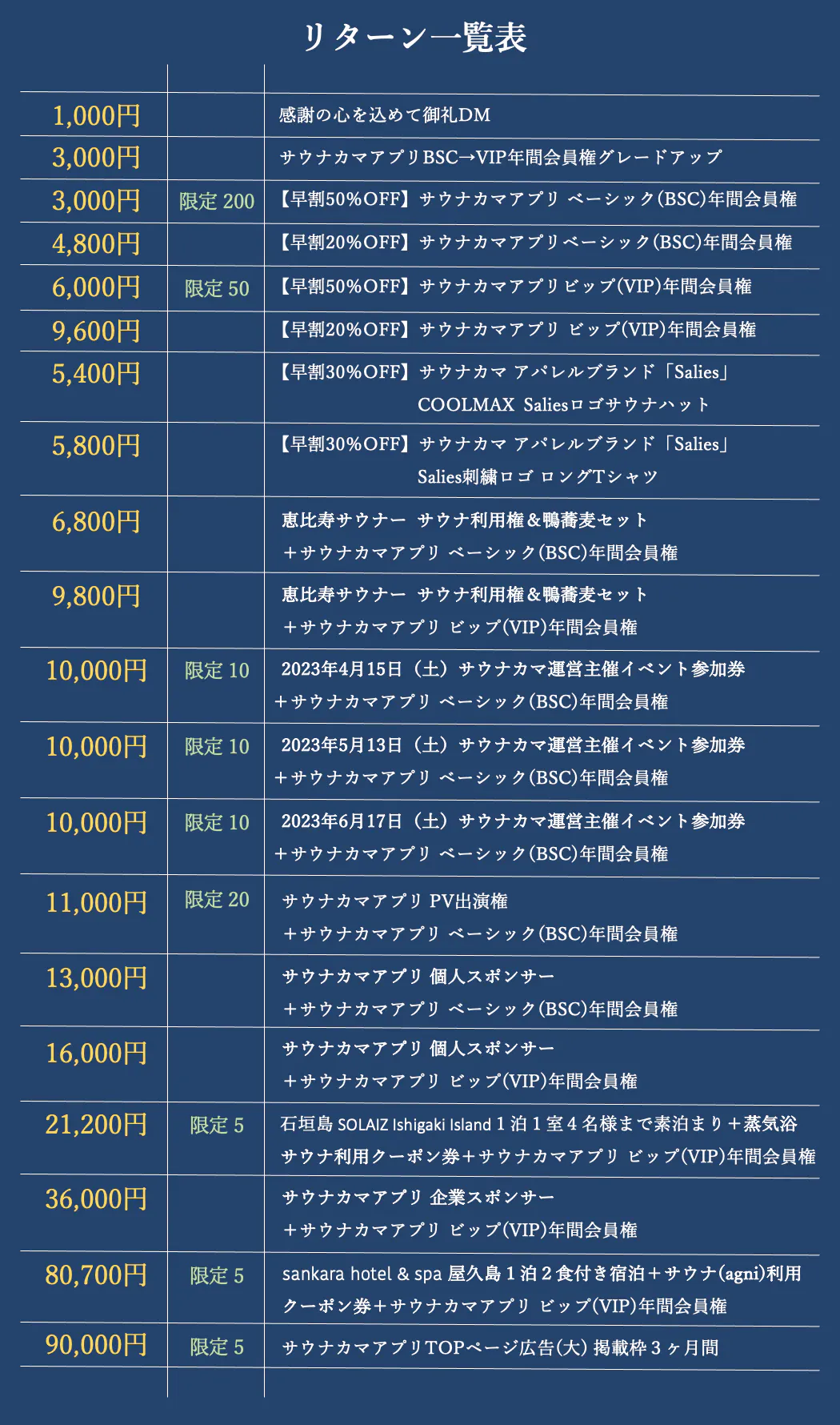 2023/05/24 11:58いつもあたたかいご支援、応援をありがとうございます!ついにリリース1週間前となりました。開発に向けたくさんの障壁を乗り越えて今に至りますが、さらなる課題も、常に浮かび上がり、また解決に挑む日々です。その毎日の繰り返しですが、よりよいサービス、サウナ生活がさらに楽しくなるようなサービスを目指し、楽しみにお待ちいただいている皆様の笑顔を想像しながら『サウナカマ』をつくっていきたいと思いますので、リリース後もよろしくお願い致します!クラウドファンディングではたくさんの方にご支援いただき、リターンにつきましてもご連絡させていただいておりますが、スポンサー様方とはまだお返事がいただけていない方もいらっしゃいますので、再度ご連絡させていただきます。その時はご対応よろしくお願いいたします。蒸し蒸しとする日が続き、梅雨に入る気配がしますが、気温差のある日もありますのでどうかお身体にお気をつけてお過ごしくださいませ。 もっと見る