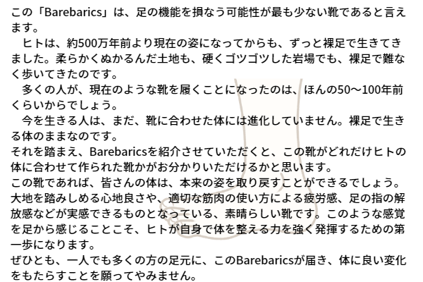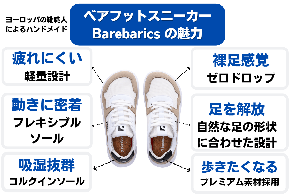 しかし、裸足で外出することは衛生上・安全上難しいので、靴本来の役割である、良い意味で『足を保護』できる『裸足感覚のベアフットシューズ』を履くことを、靴選びの新しいトレンドかつ普遍的なライフスタイルとしておすすめしたいと考えております。そのファーストチョイスが、【Barebarics】です。
