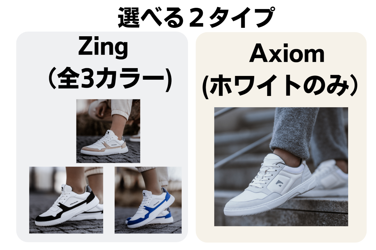 ①【Axiom】と【Zing】の2タイプがございます。【Axiom】はホワイトのみ、【Zing】は3カラーございます。