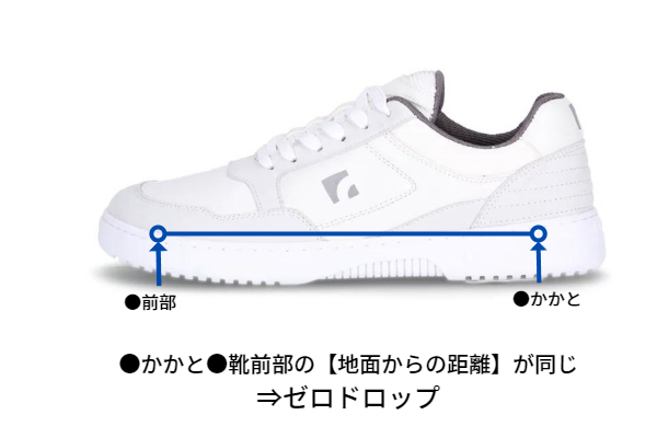 裸足と同じように、シューズの前後の高低差がありません。あえて、余計なサポートをしないことで、足本来の機能を最大限発揮させます。軽量でアーチがないため、脚の疲労を防ぎ、正しい歩行をサポートします。