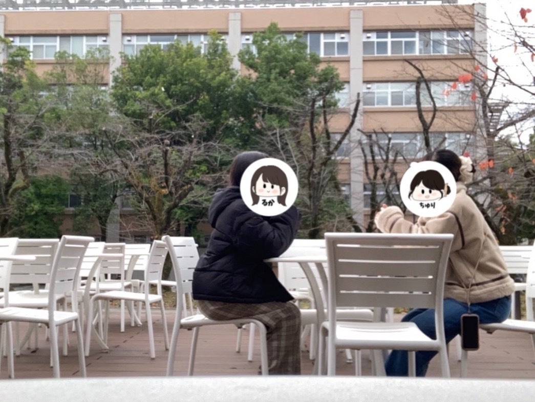 私が入っている【記念誌班】はこっちの第2食堂テラスをよく使っているよ!