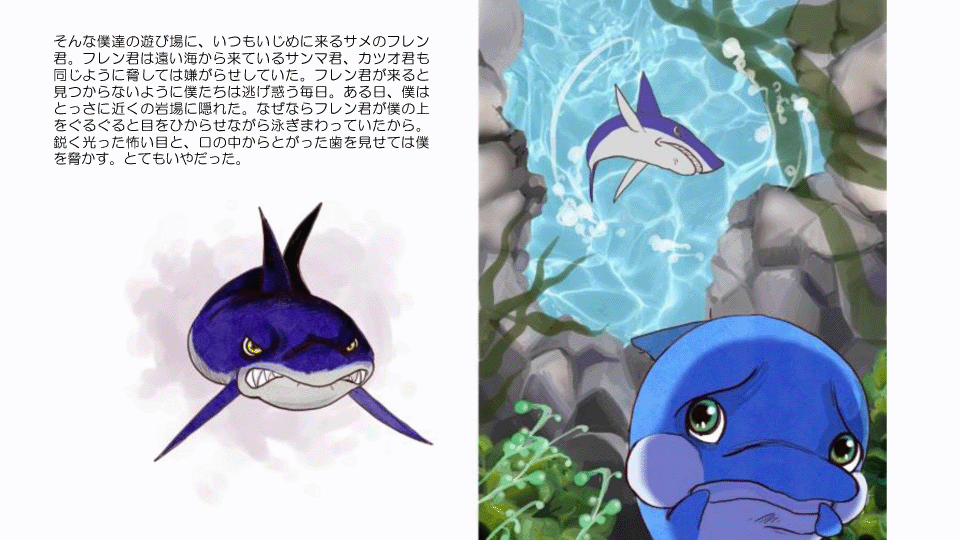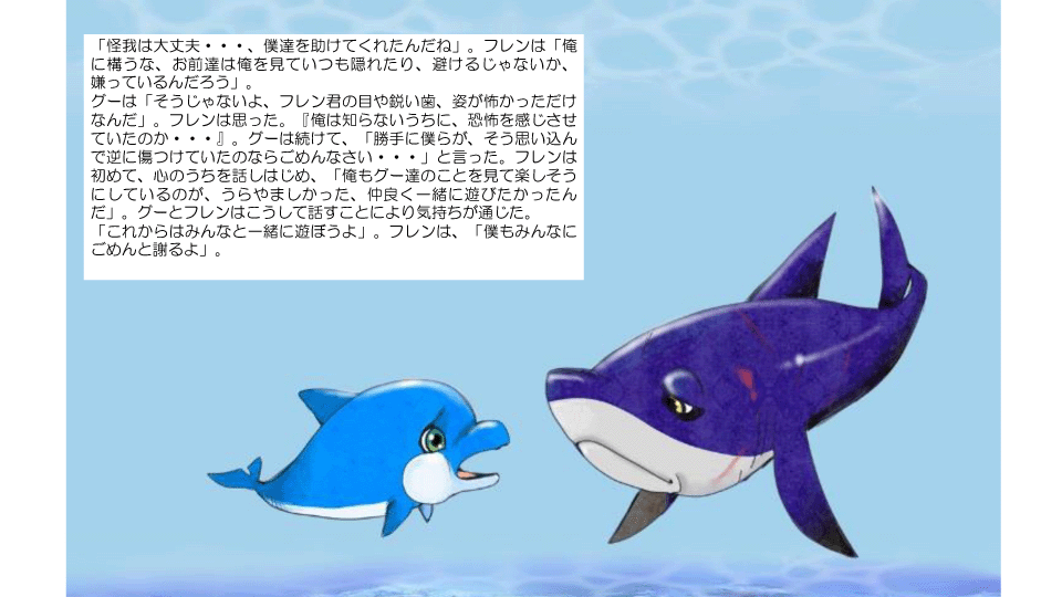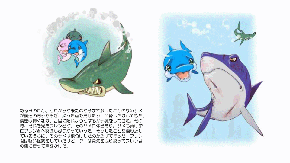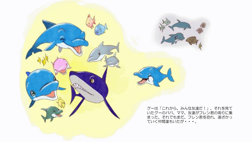 挿絵には、多くのイラストレーターや画家の方々から、申し入れがありました。イルカの絵で有名なクリスチャンラッセンさんも、この物語について知ると、とても共感していただき、「ぜひ一役を担いたい」と、海のいろいろな生き物達のキャラクターイラストを描いていただきました。しかし今回は、筆者の思い描く物語のイメージ、キャラクターにぴったりと合うイラストが他の方から応募があり、こちらが採用となりました。イラストを描いてくださったクリスチャンラッセンさんに、この場をお借りして御礼を申し上げます。