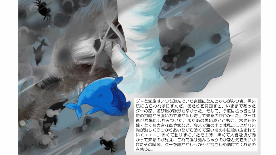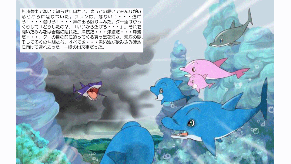 この先グー、そしてフレンと仲間達、グーのパパとママが津波に飲み込まれ、突然環境、生活が変わってしまいます。彼らにどんな試練が待ち受けているのか・・・