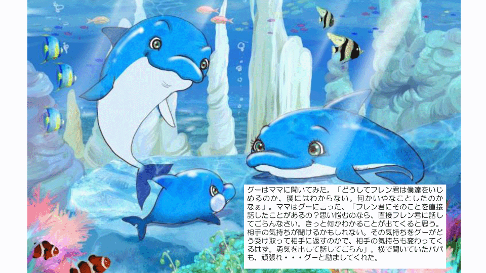 我々グループは10年以上に渡り、全国の幼稚園、小中学校、高校など延べ300校以上で、私たちの作った絵本を使った読み聞かせの授業をしており、現在も年間数十校を回っています。いじめや自殺の防止のために、子供達に絵本を使ってわかりやすく、心の授業を行っています。