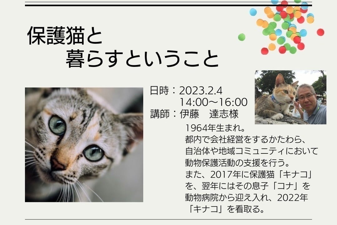 そして2023年2月4日(土曜日)には、経営者で動物保護活動家の伊藤達志様をお招きし、「保護猫と暮らすということ」というテーマでお話しいただきました。保護猫はペットショップ等で出会う猫と全く違うと考える方もいらっしゃいますが、そんなことはない、ということを語っていただきました。保護猫も他の猫と同様にとても可愛く、家族の一員になれるのです!