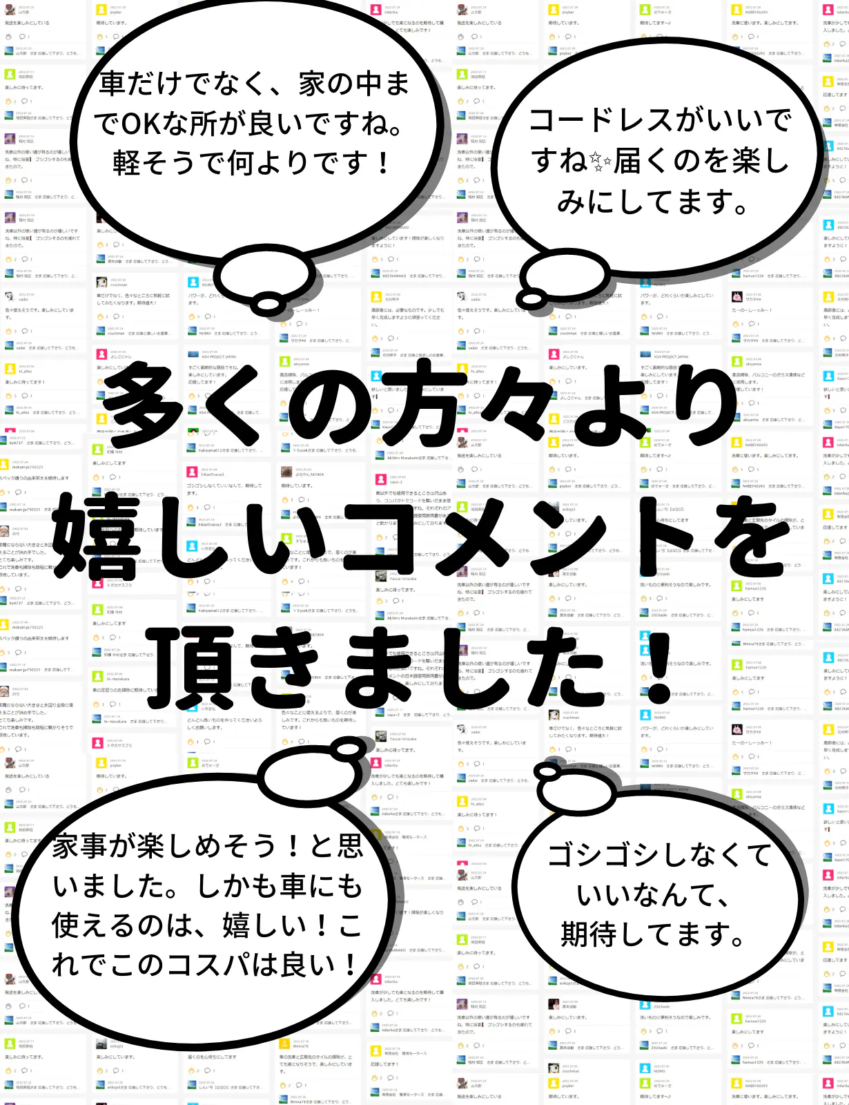 「邪魔にならない大きさと水回り全般に使えることが決め手でした。とても楽しみです。これで洗車も掃除も時短に繋がりそうで期待しています。」