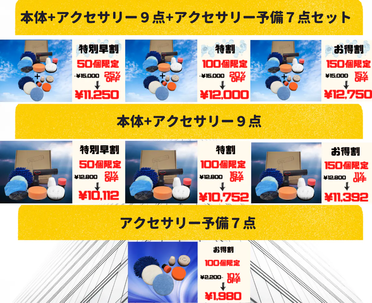 (例:洗車時にスポンジアタッチメントを使用し、濡れたスポンジをそのままワックスがけには使用出来ないので、もう一つのスポンジアタッチメントでワックスを塗布します。)