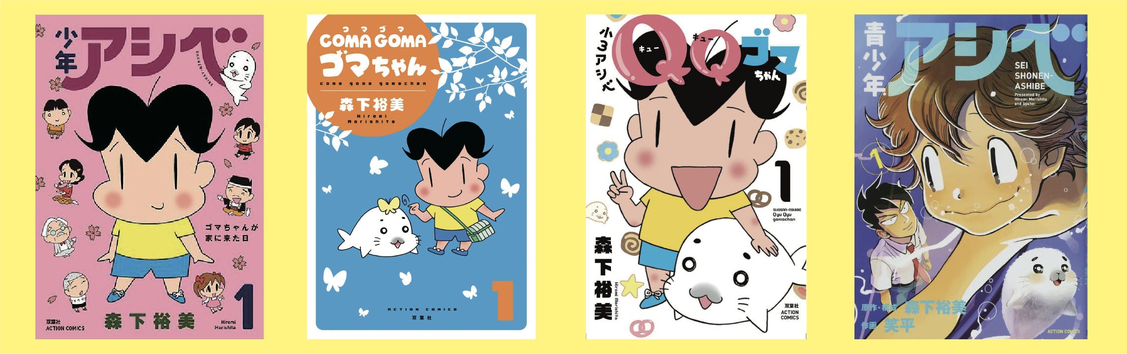 ゴマちゃんは漫画『少年アシベ』で1988年にデビューしました。『少年アシベ』はアニメ化され、「キュ〜」と鳴く白いアザラシのゴマちゃんは一大ブームを巻き起こし、ぬいぐるみはコピー商品が出回るほどの大人気に。『少年アシベ』連載終了後もアシベが小学2年生になった『COMAGOMA』(コマゴマ)が連載。