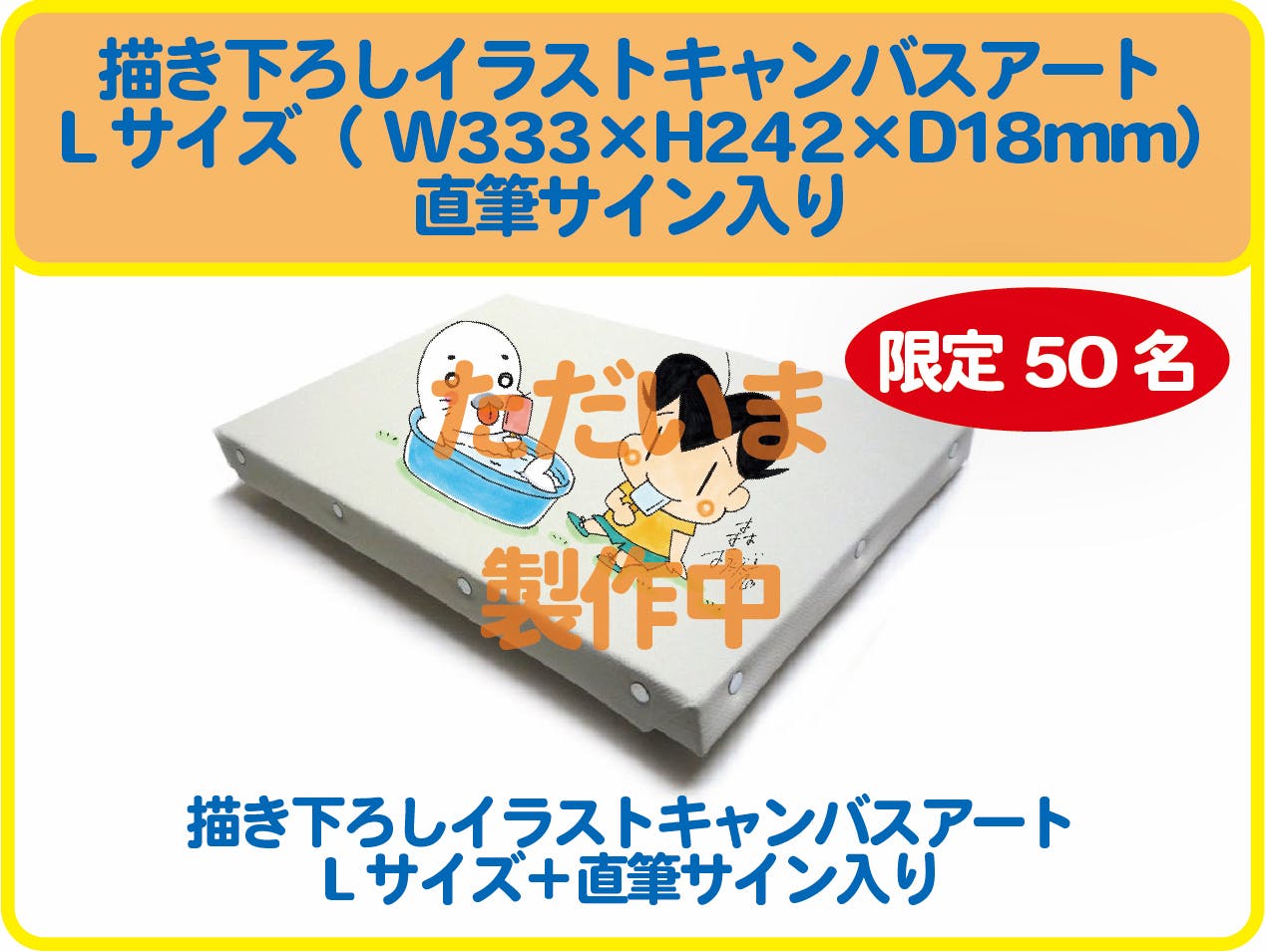 描き下ろしイラストを高精細プリントしたF4号サイズ(W333xH242xD18mm)のキャンバスアート。