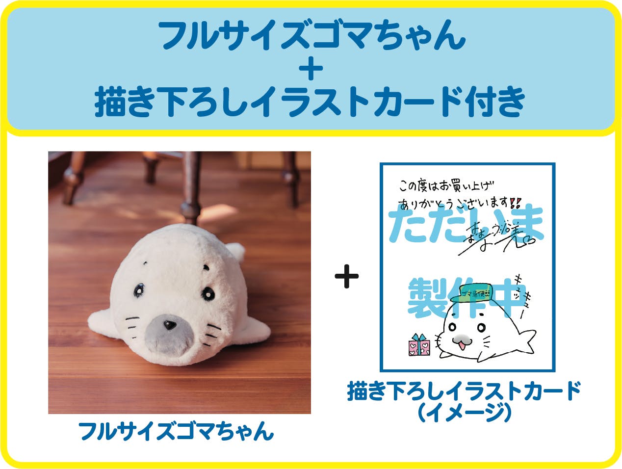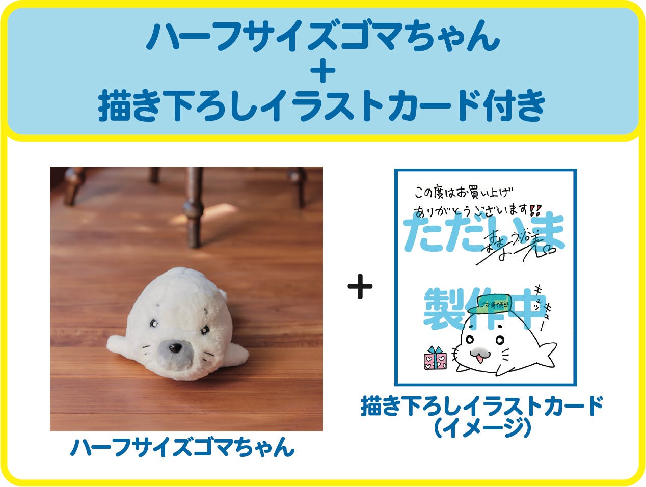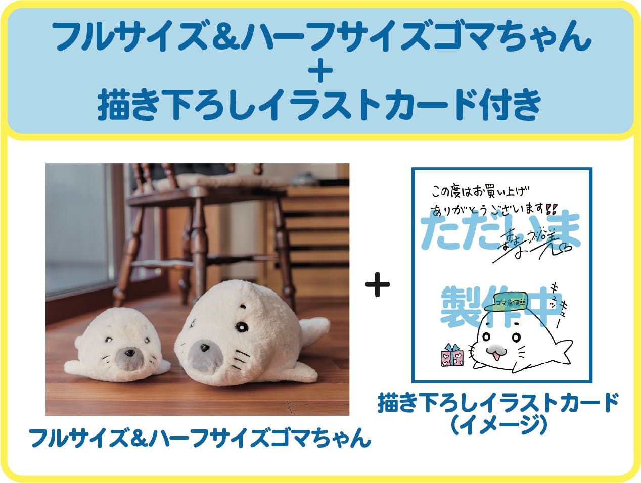 全長約35cmのおでかけにぴったりのゴマちゃんハーフサイズと、クラファン限定描き下ろしイラストカード付きのプラン。