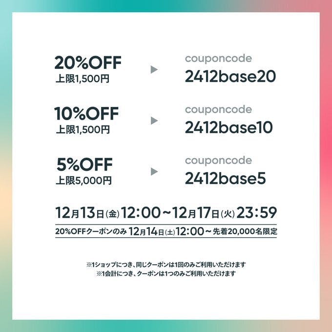 2024/12/13 10:38本日より #BASE感謝祭 開催!クリスマスプレゼントにもぴったりのゴマちゃんぬいぐるみ等、ゴマちゃんホンポの商品全品がお得な値段で購入できます!利用可能時間2024/12/13(金)12:00~ 12/17(火)23:59まで。20%OFFクーポンのみ12月14日(土)12:00より先着20000名限定でご利用いただけます。クーポン詳細は画像を確認してください。 もっと見る