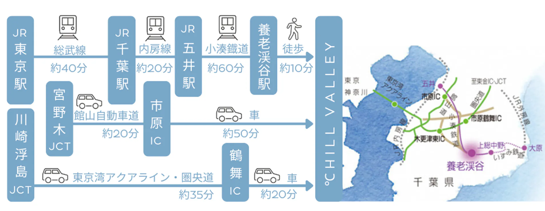 お車: 川崎浮島JCTから東京湾アクアラインを利用して、圏央道市原鶴舞ICまで約35分→車で約20分
