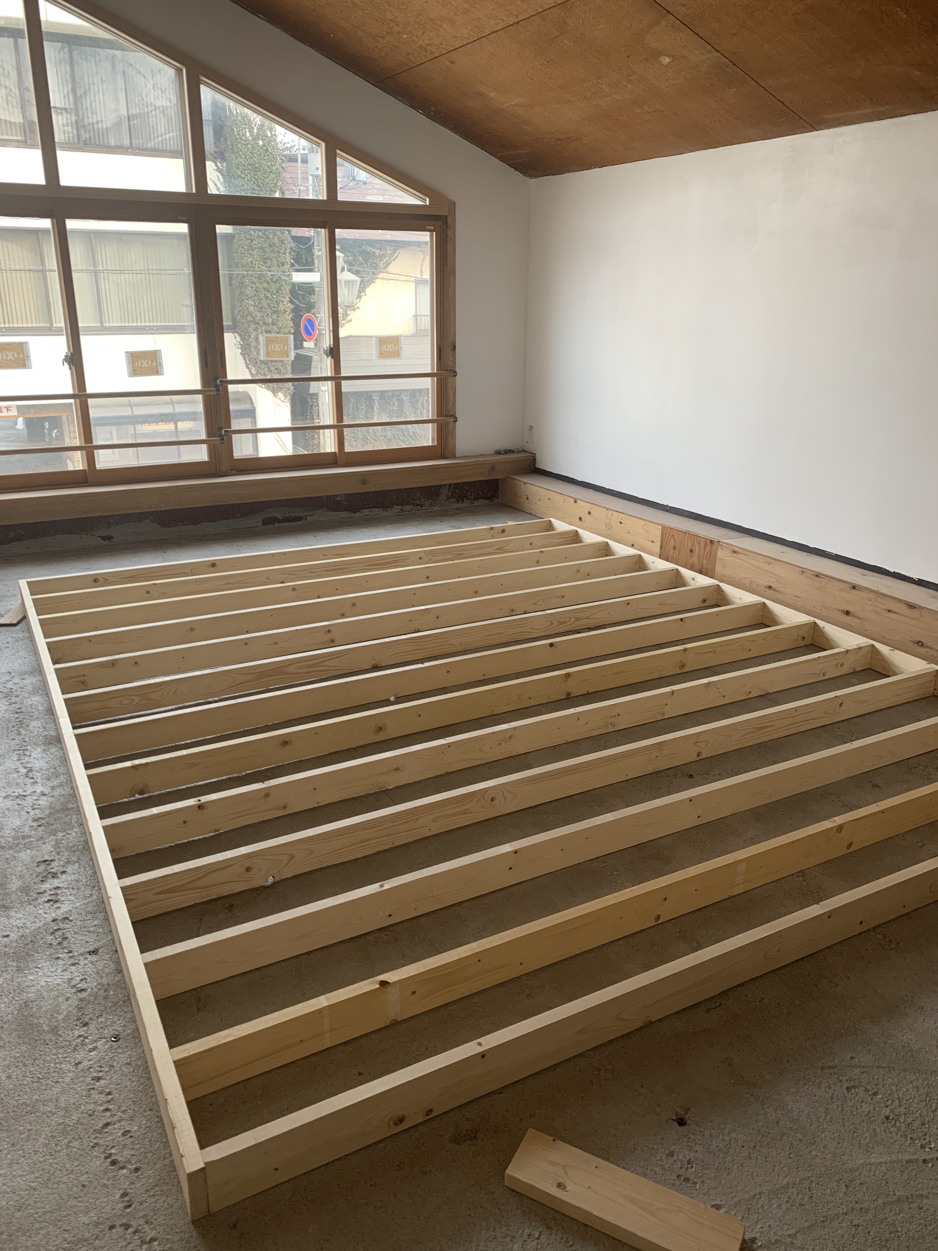 ご支援いただき、皆様ありがとうございます。Re:Publicの田中です。空き時間を利用して、2階の宿泊施設のベッドの小上がりを作っています。小上がりのサイズは3600mm×3000mmで設計。JIS 企画のベッドを二つ設置できるサイズです。材料は30×105×の3000の間柱用木材13本、30×105×の4000の間柱用木材2本、910×1820のいわゆるサブロク合版を16枚(2枚重ね利用)。一人作業の為、四隅の固定はこういう補助具を使います。間隔は1尺(303mm)にして、さぶろく合版を固定しやすいようにします。次は組み上がった基礎の中に断念材を入れて、板を貼ります。板を貼るのはまた次回に行う予定です。皆様に快適にお過ごしいただけるように一つ一つ作り上げていきます。引き続きよろしくお願いいたします!