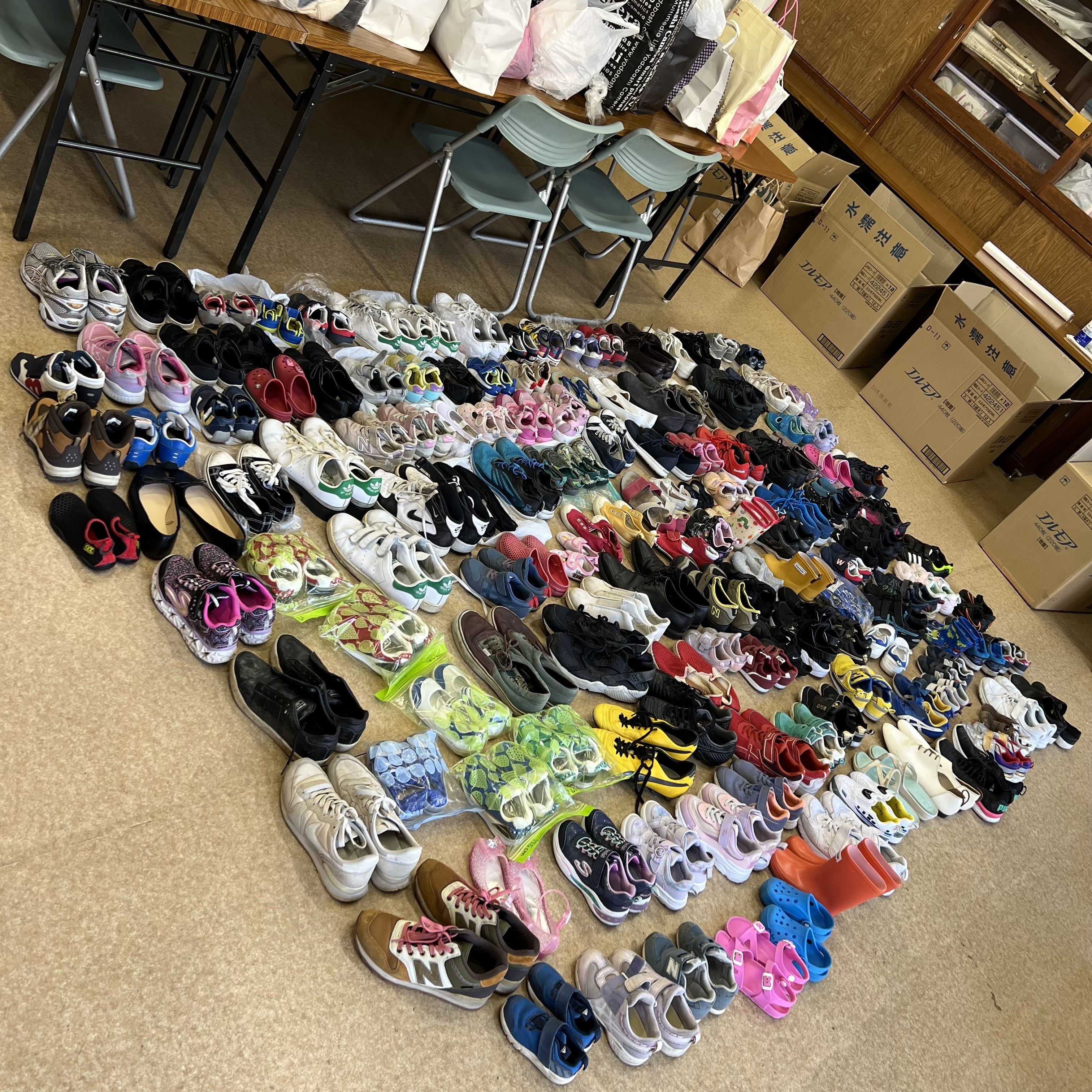 皆さんこんばんは。佐々木です。園児、保護者の前で公演をさせて頂いてから12月10日から12月20日の間で支援物資の募集期間を設けさせてもらいました。そして本日すべて引き取りに行ってきました。集まった合計、大人サイズの靴も含めますが164足!!!一緒に不要になった洋服も寄付いただきました(洋服は数え切れませんでした。300着くらいあるかと。。)2校に寄付するので、1校あたり84足寄付できる見通しになりました。本当にレジナ幼稚園様には頭が上がりません。今後、日本郵便さんと梱包や配送について相談をする予定です。思っていた以上に集まったので、洋服は船便で送るかもしれません。(予算の都合上)少しでも早く、靴を届けられるに頑張ります!!!
