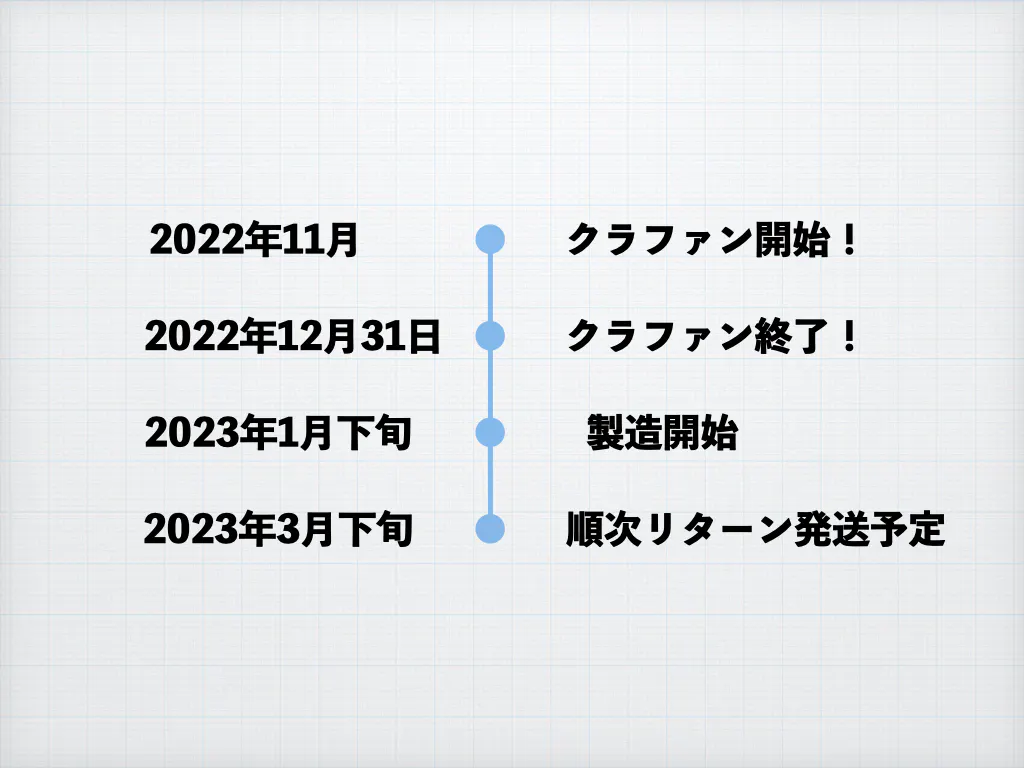 ・スケジュールはあくまでも予定です。お届けの遅延を理由にキャンセルをすることはできませんが、6ヶ月以上遅延した場合は希望者に限りキャンセル対応いたします。