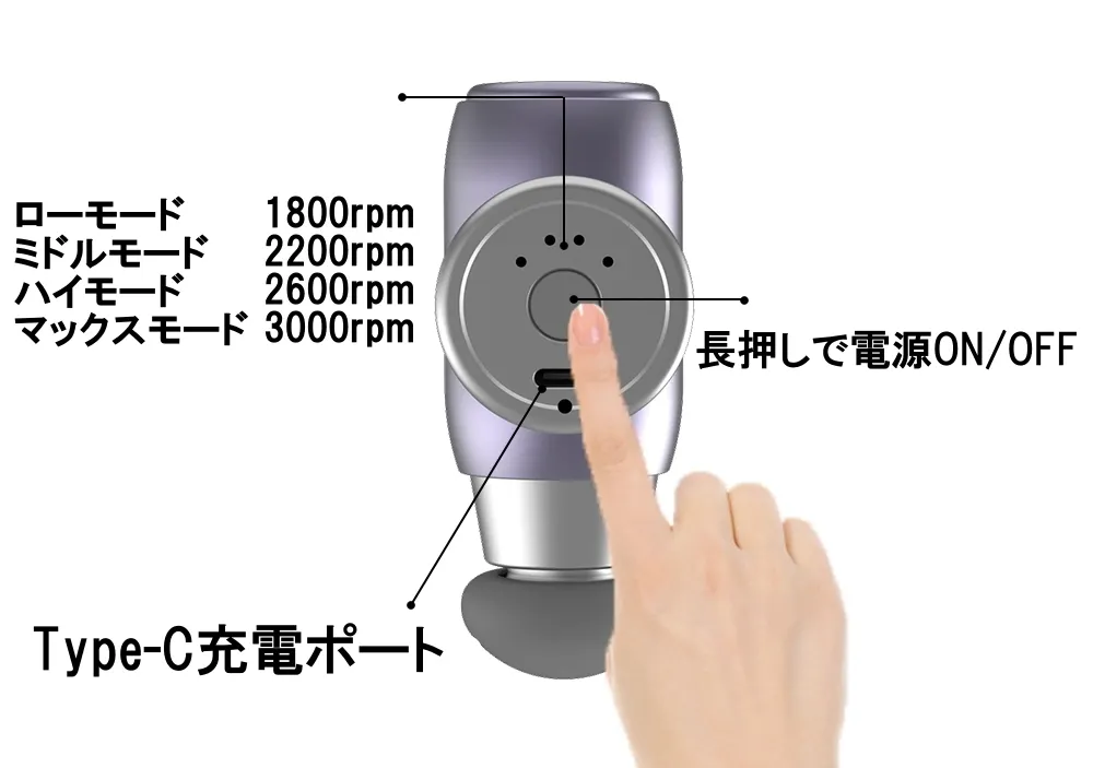 「CROSSGUN」は説明書を見なくても使える程のシンプルデザイン。電源ボタンを長押しでON/OFF。稼働中に電源ボタンを短く押すことによって4パターンに強さが変わり、ランプでお知らせしてくれます。