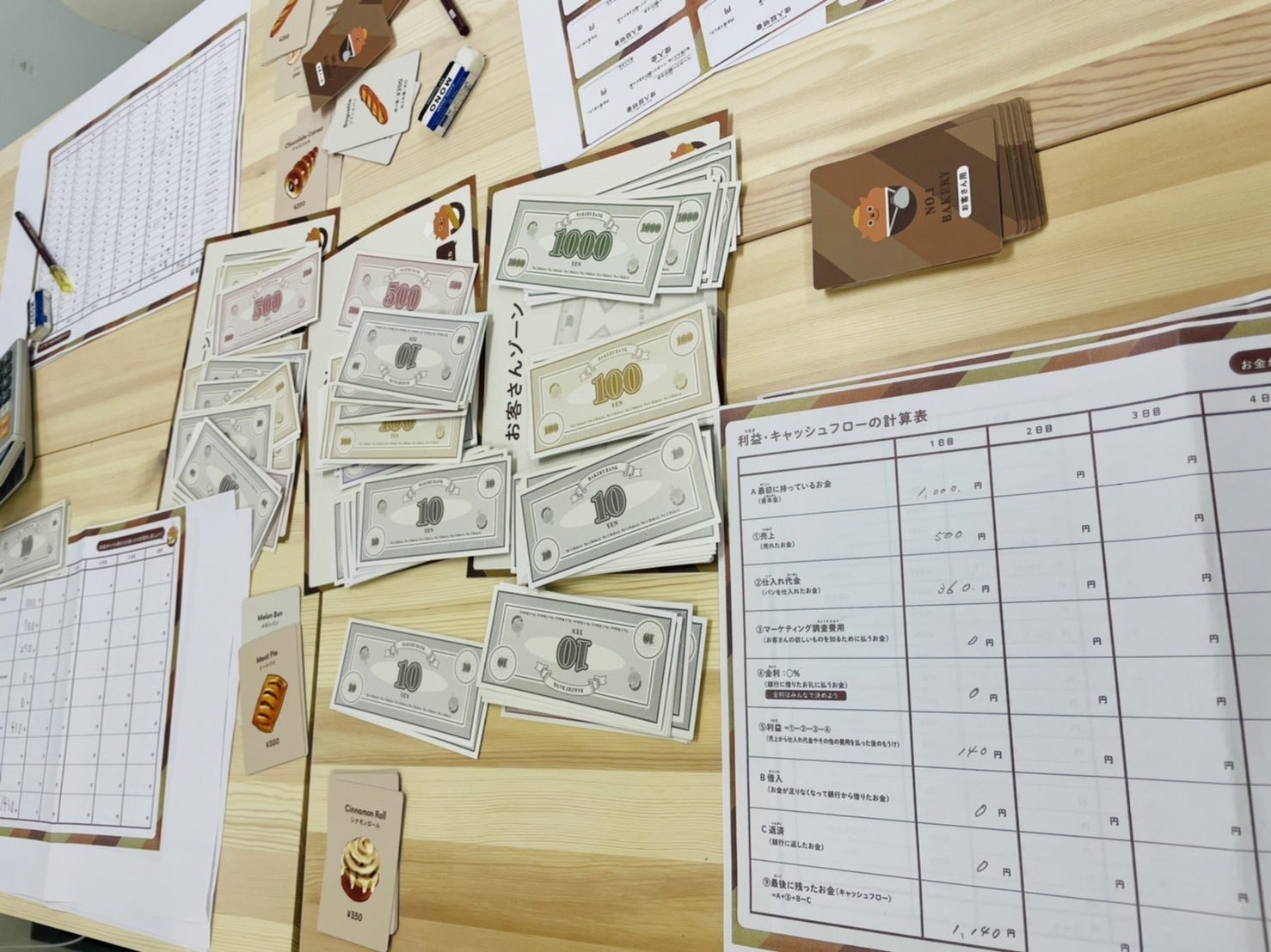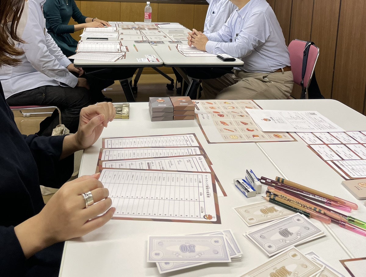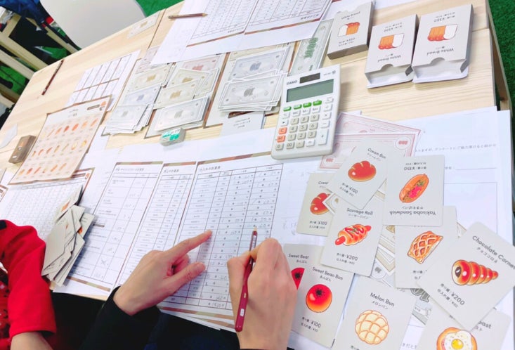 こんにちは!「ナンバーワン・ベーカリー」開発チームです♪今回は、ナンバーワン・ベーカリーを使ったイベント風景をご紹介します!ナンバーワン・ベーカリーの通常版は既に販売中です。こちらは研修等で使えるよう、6名まで遊べる大型サイズになります。この通常版を使ったイベントを、2022年2月に実施しました!今回、子どもの参加者は8歳~13歳と幅広く、パン選びを楽しんだり、仕入れでどれだけ節約できるか考えたり、お客さんへの質問を工夫したり…皆それぞれ、ゲームに真剣に向き合ってくれました。大人の参加者も、ゲームに勝つ(お店のもうけを出して、手持ちのお金を増やす)方法をたくさん考えて、もうけが出れば喜び、売れなければ「えー!?」と一喜一憂しておりました。ゲームだからといって子どもばかりが夢中になるのではなく、大人の方でものめり込めるのが「ナンバーワン・ベーカリー」の醍醐味です☺ちなみに、今回の勝者は10歳の男の子でした!!すごい!↑勝者のメモと計算表を見てみると、お客さんが好きな食べ物・パンの系統という抽象的なことから、選んだパンのだいたいの数といった具体的なことまでバランスよくヒアリングしていました。そして、仕入れはかなりシビアに「できるだけ節約したい!」と慎重に選んでおりました。慎重な仕入れとマーケティングの上手さで見事に利益を出し、キャッシュフローをたくさん残して勝利しました!このように、年齢関係なく遊べて、学びに繋げられるのが「ナンバーワン・ベーカリー」の特徴です★みなさんもぜひ遊んでみてくださいね!