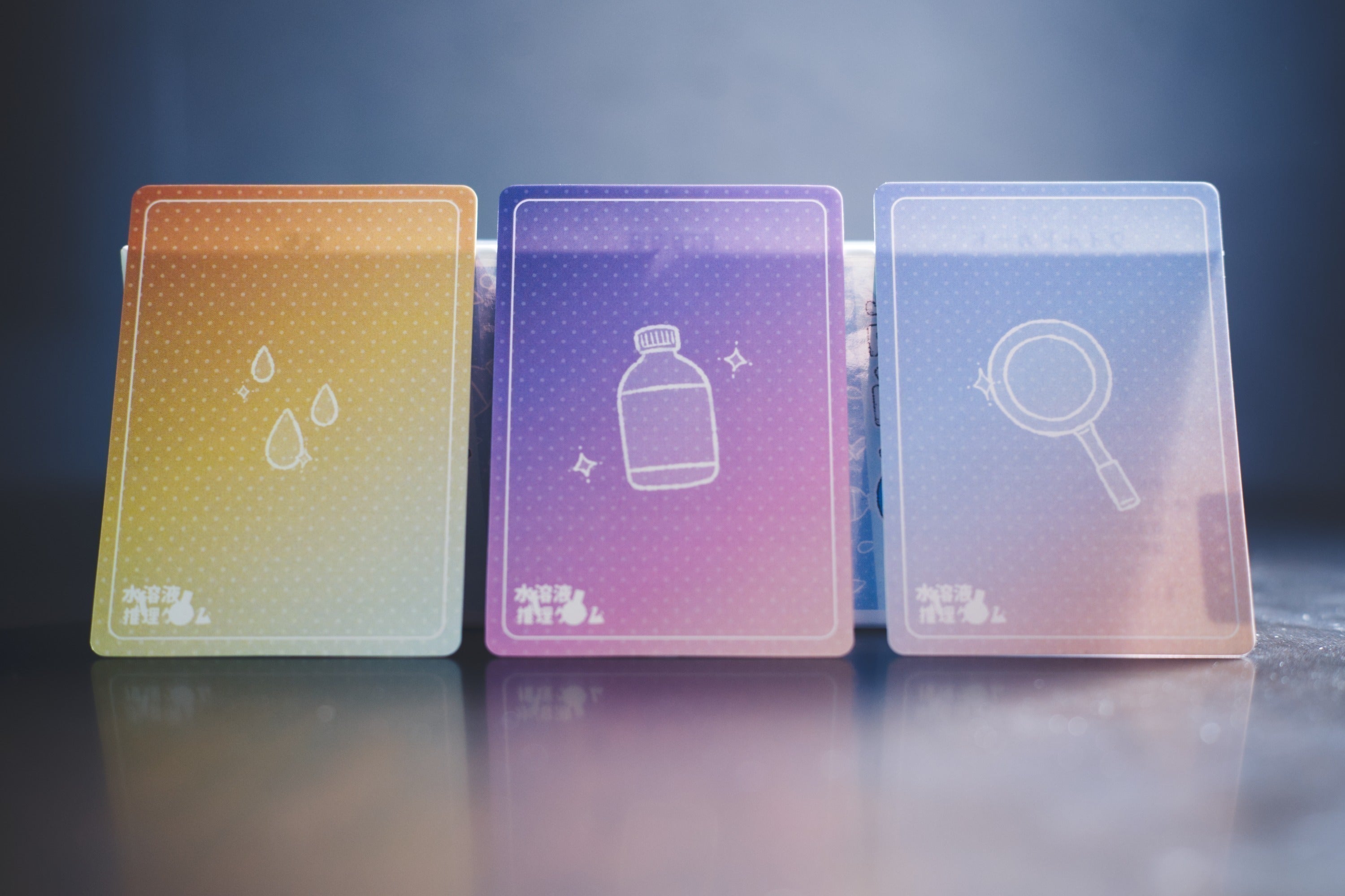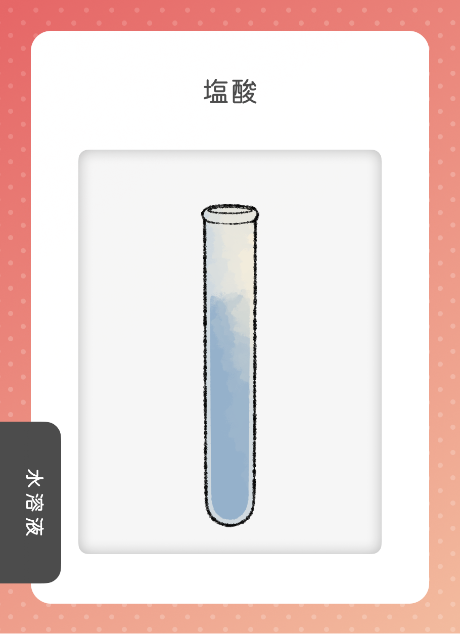 また、ビジュアル的にも分かりやすくするために、酸性の水溶液は赤色、中性の水溶液は緑色、アルカリ性は青色が水溶液カードの外枠に使用されており、あまり水溶液に詳しくない方にも優しいデザインを心がけています❤