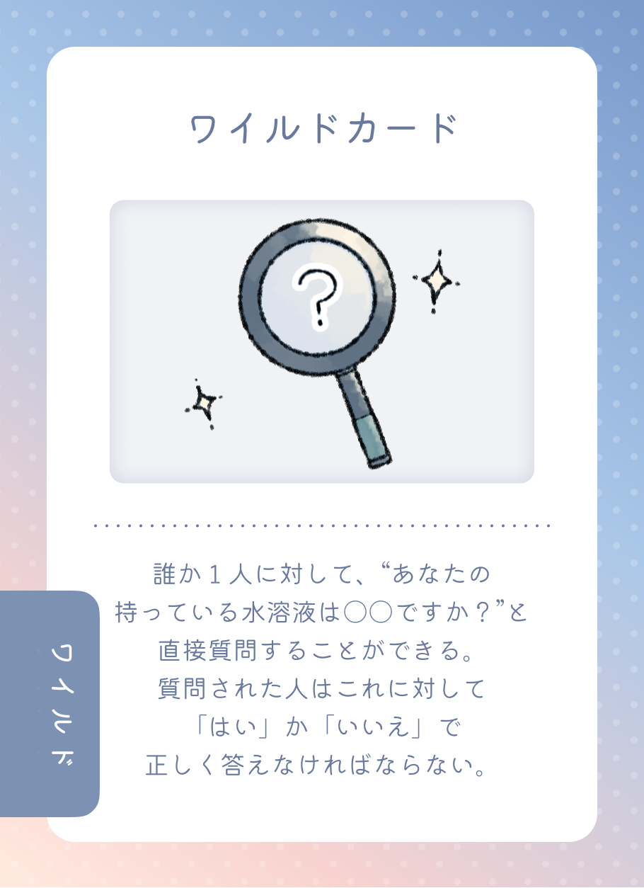 ワイルドカードは1種類のみで、「誰か1人に対して“あなたの持っている水溶液は○○ですか?”と直接質問することができる」という効果を持ち、質問された人は「はい」か「いいえ」で正しく答えなければなりません🔍