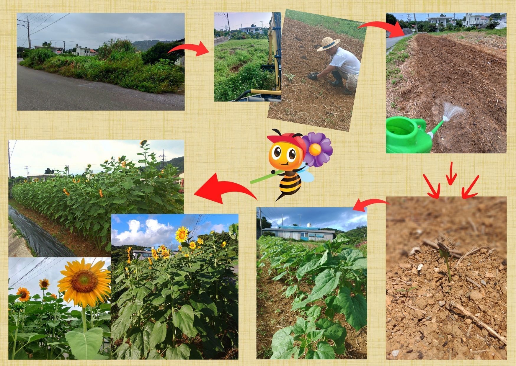 ● 子供からお年寄りまで集いの場所である稲嶺公民館その向かいある長年お休みしている放作農地を活用し蜜源が著しく減る夏場の代表的な明るいお花、ヒマワリを植え付けてみよう!と思い活動して見ました。