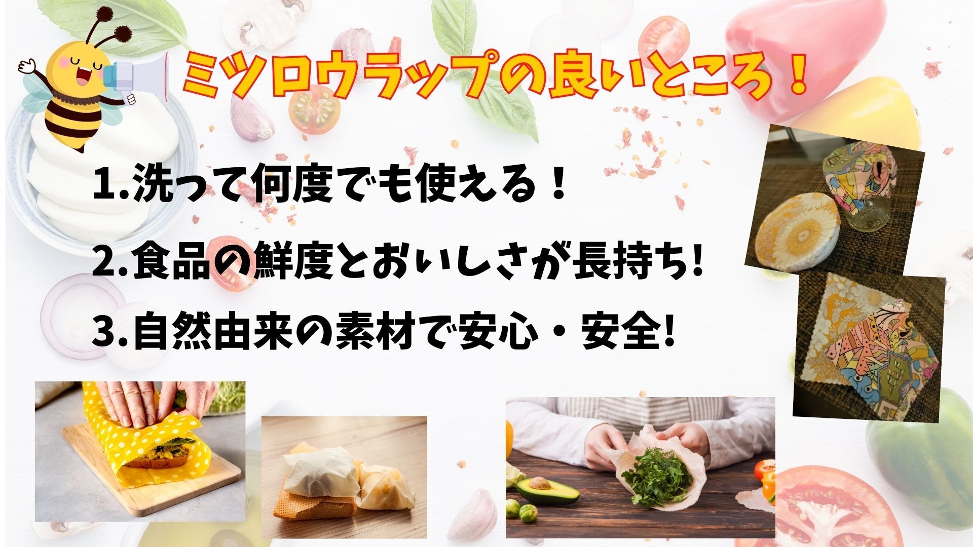 ミツロウ特有の天然の保湿性と抗菌性が、包んだ食品の鮮度を長持ちさせてくれます。みつろうラップで包んでおくと、野菜を生き生きとしたまま保存できます。