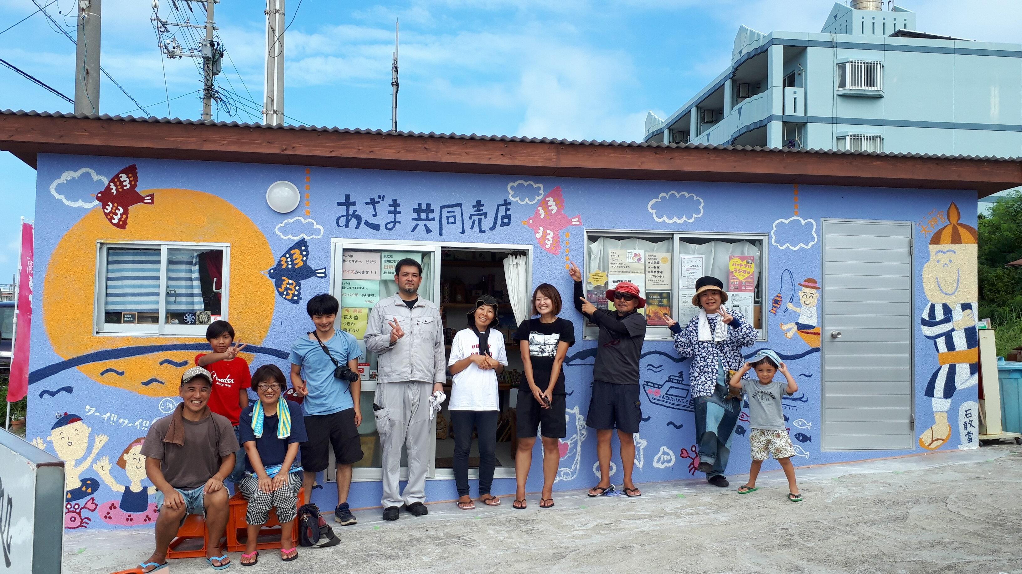 地域のデザインのお仕事で南城市の安座真に関わり、即効で家族まるごとあざま共同売店にはまる。その後、売店で地元の方と一緒に売店に壁画を描くイベントをやったり、安座真を散策できる地域マップを明美さんと作ったり、あざま共同売店を中心に家族で遊ばせてもらっています。