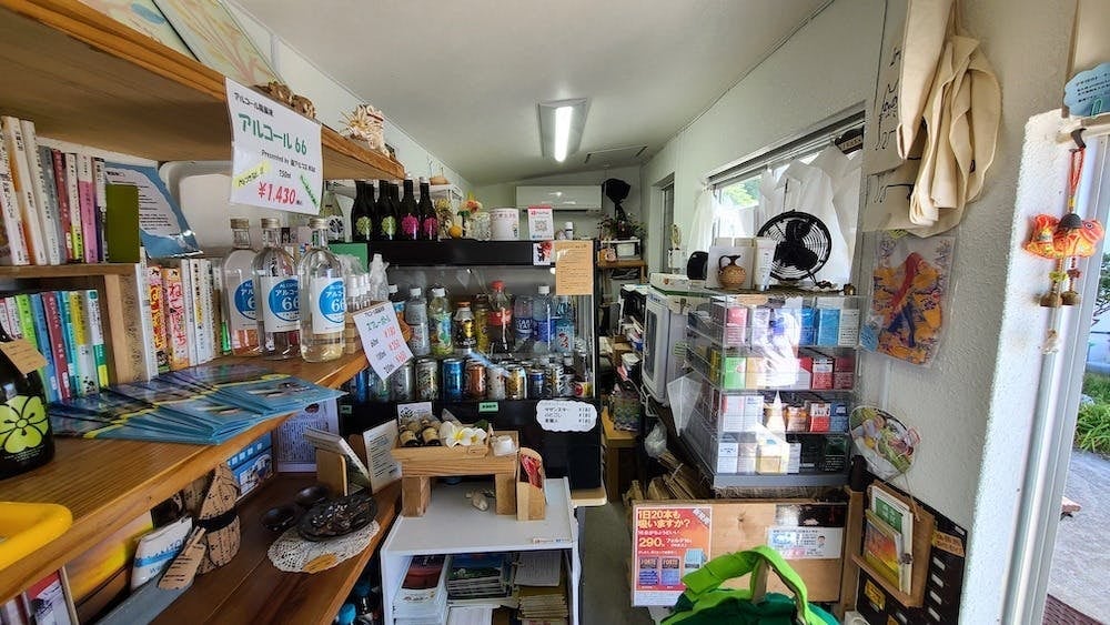 通常の売店としての営業以外にも、南城市の公共バスのチケット販売、荷物の一時預かり、地域図書館、お年寄りには難しい役所への申請手続きなどの代行、体の不自由な方にはご自宅まで商品を届けたり、地域の方のいろんな困りごと等にもボランティアで手助けしたりと、あざま共同売店は地域に無くてはならない存在です。
