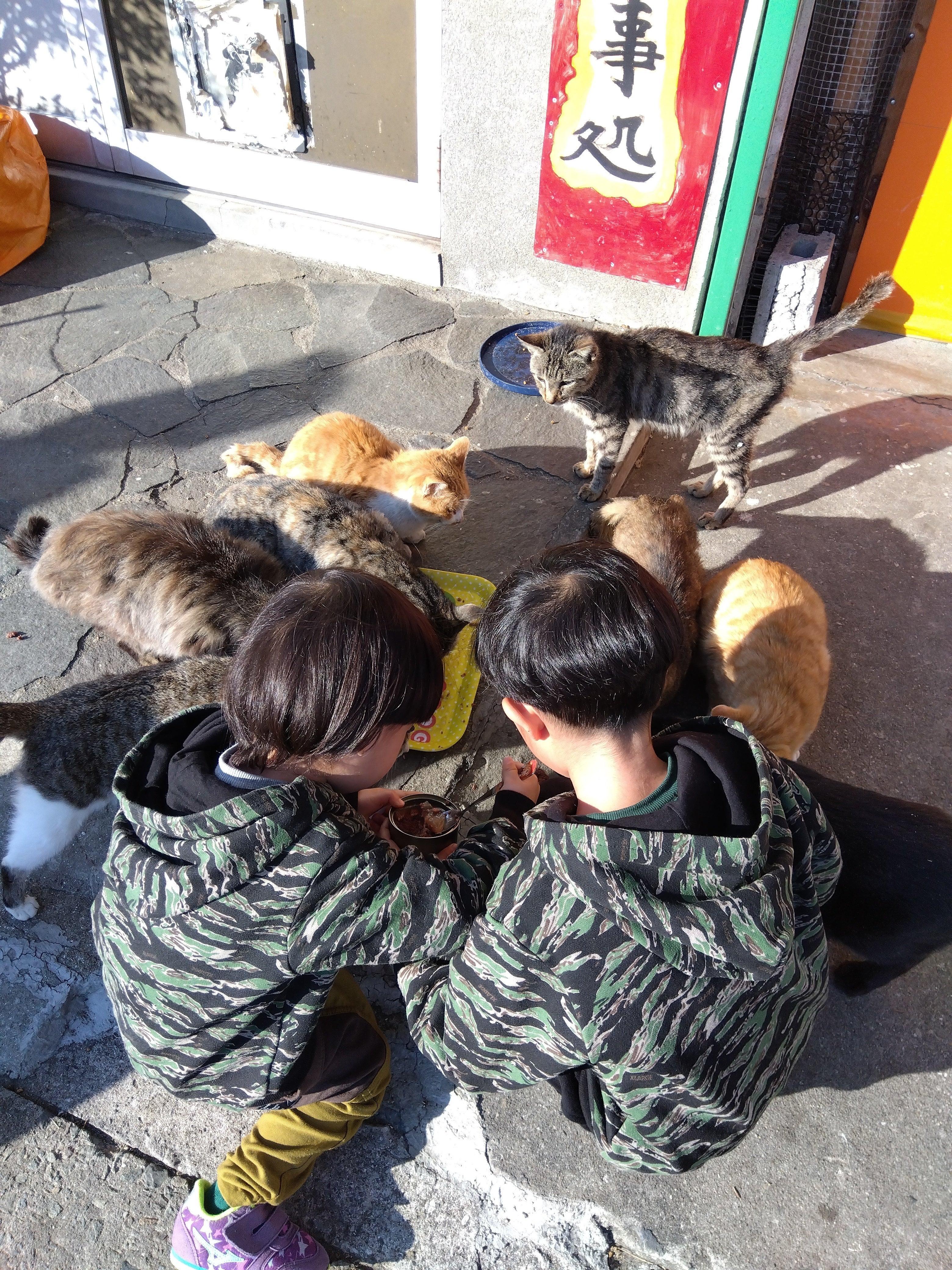 今日、小さな男の子たちとご両親が、うちの前で猫たちと触れ合っておられました。