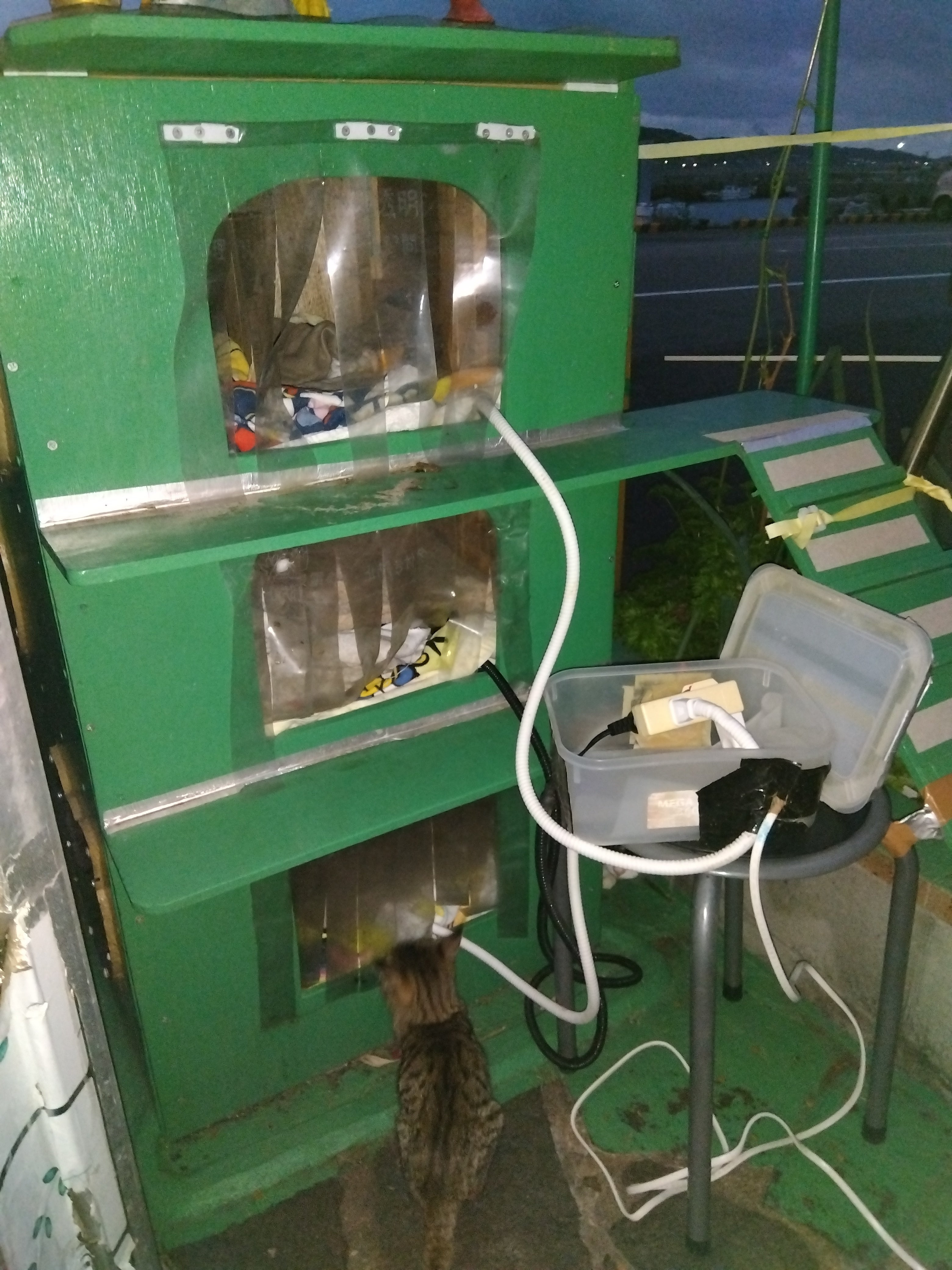 というわけで、去年購入したペット用ヒーターを、島にゃんハイツの各階に設置しました。