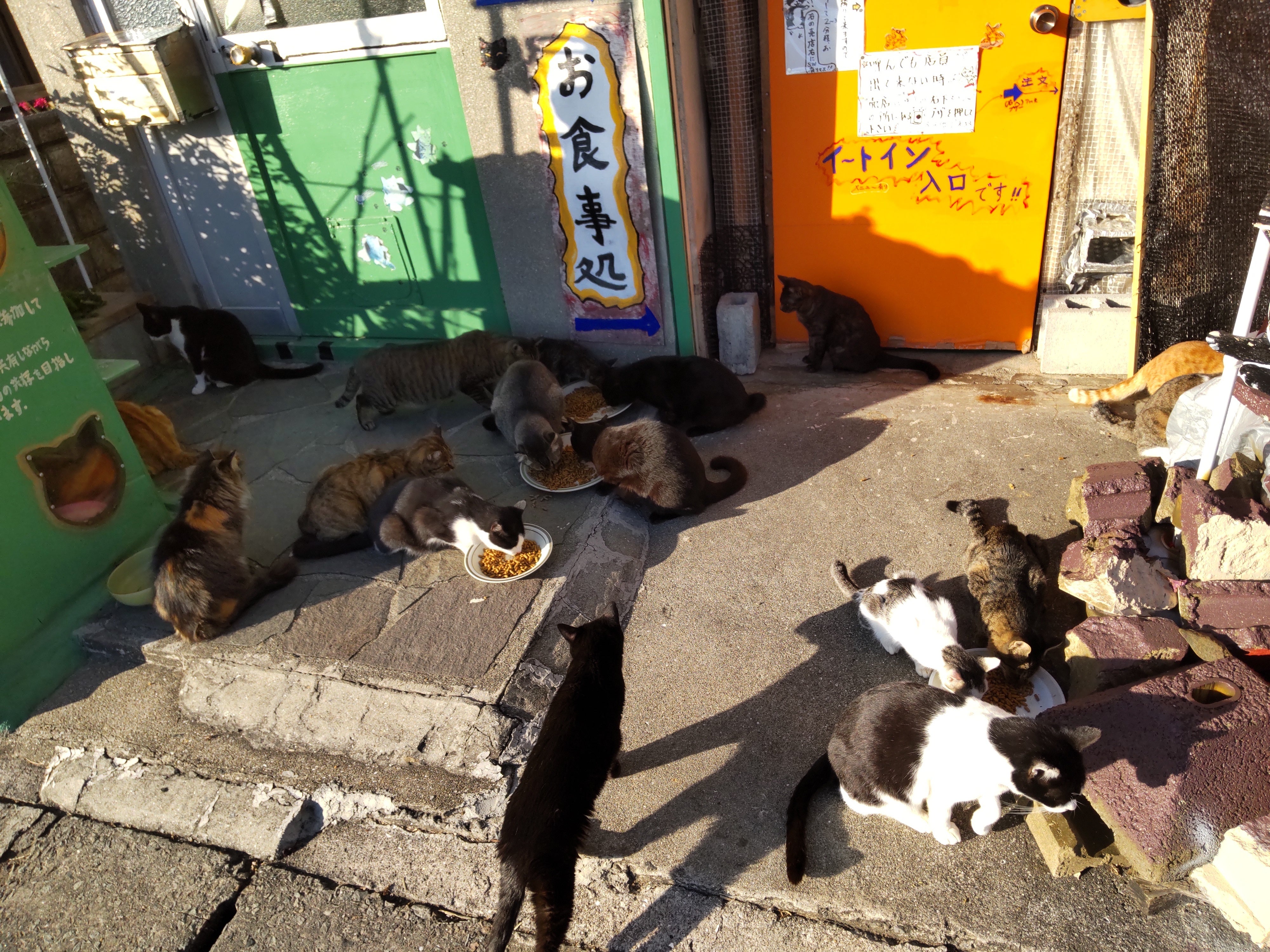 通詞島の猫たちは、冬に向けての食い込み期に入っており、とにかく大量に食べています。普段、見かけないコも食べに来ているようで、だいたい15~21匹になります。