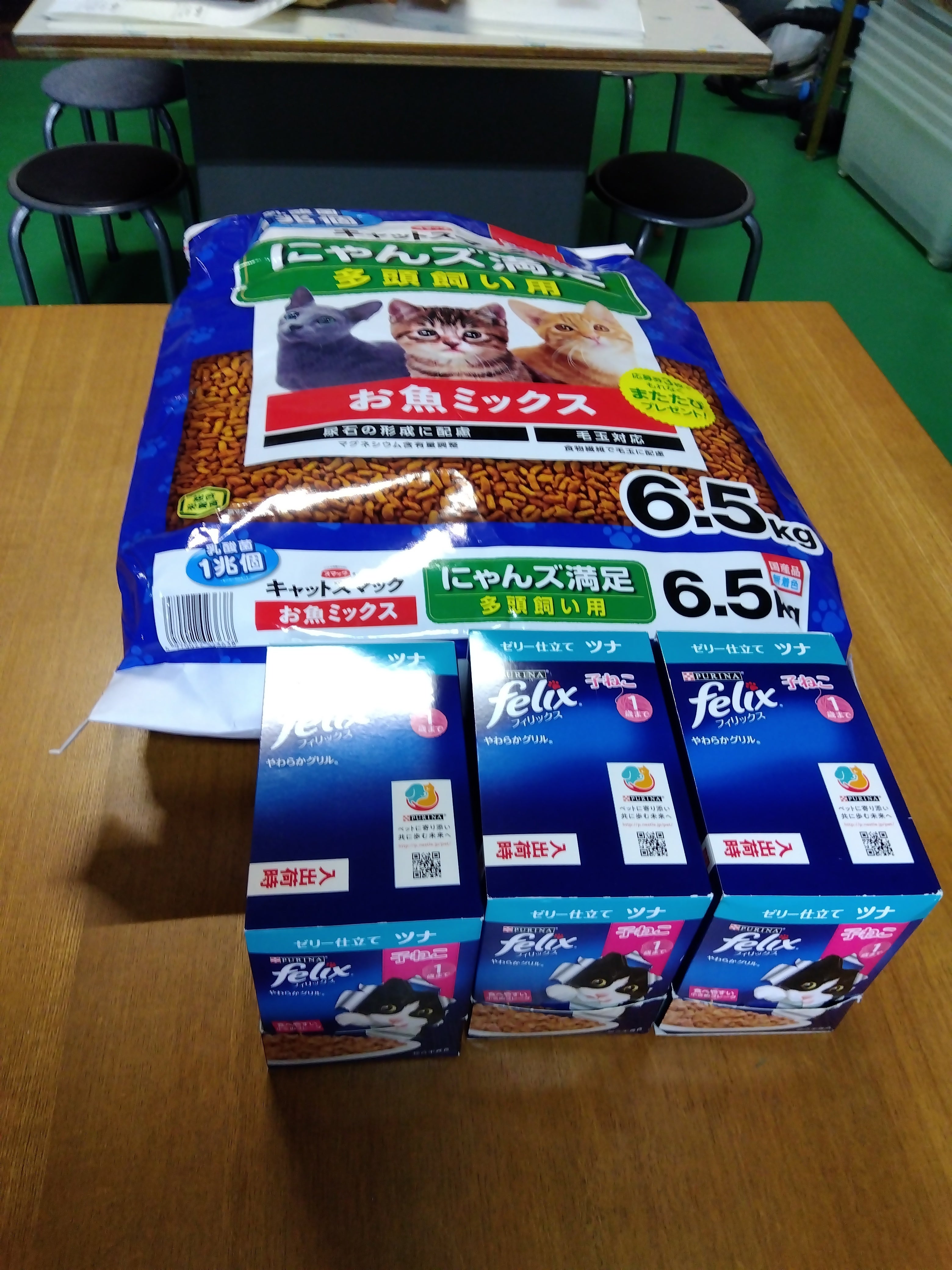 キャットフードが届きました!にゃんズ満足 さけ&ささみ 6.5kgにゃんズ満足 お魚ミックス 6.5kgA,M様より頂きました。有り難うございました。猫島サミットお疲れ様でした。更に、うちにもお寄り頂きまして、有り難うございました。また、お会いできて嬉しかったです。メッセージも、ご丁寧に有り難うございました。