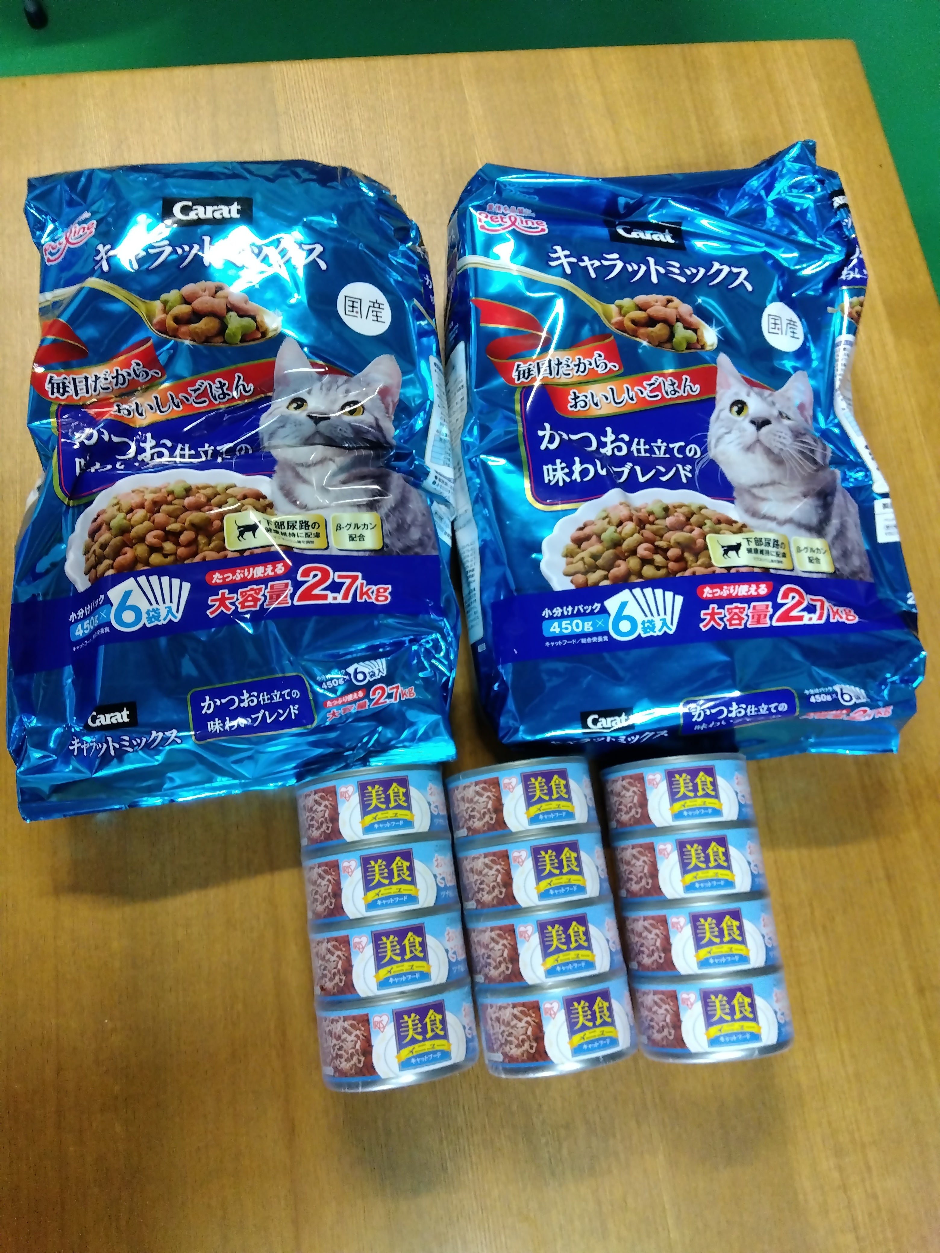 キャットフードを頂きました!キャラットミックス2.7kg×2おいしいごはんツナ&しらす4P×3N.O様、有難うございましたm(_ _)mメッセージも嬉しく拝見致しました。3日ほど前に、また子猫が捨てられました。フカフカした黒猫(推定3ヶ月)1匹とキジトラ(推定2ヶ月)2匹です。3匹とも人間を怖がりません。慣れています。島にゃんハイツに何度も誘導しますが入りません。その内、入ってくれると思います。