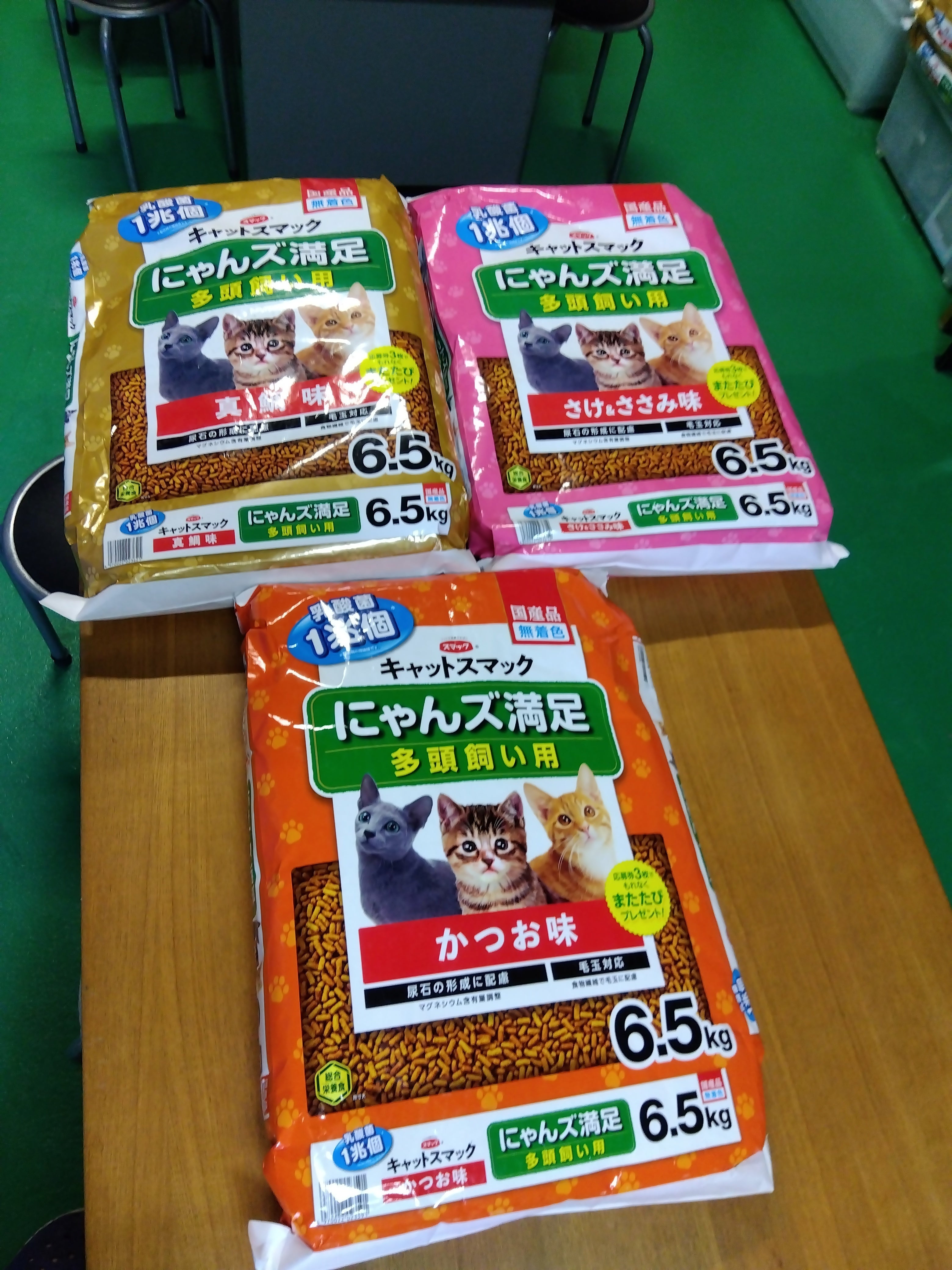 キャットフードを頂きました!にゃんズ満足真鯛味6.5kg×1にゃんズ満足さけ&ささみ6.5kg×1にゃんズ満足かつお6.5kg×1Y.A様 昨日と別便で頂きました。たくさん有難うございましたm(_ _)m皆様から頂いたフードで、猫たちはお腹いっぱい食べられるので、捨てらて辿り着いた腹ペコの猫も、最初は威嚇したり怯えたりしていても、しばらく経つと、穏やかな顔になってきます。 そんな様子を見ていると「この活動をやって良かった」と、しみじみ思うのです。 皆様が、こうして手助けして下さるおかげです。有難うございます。
