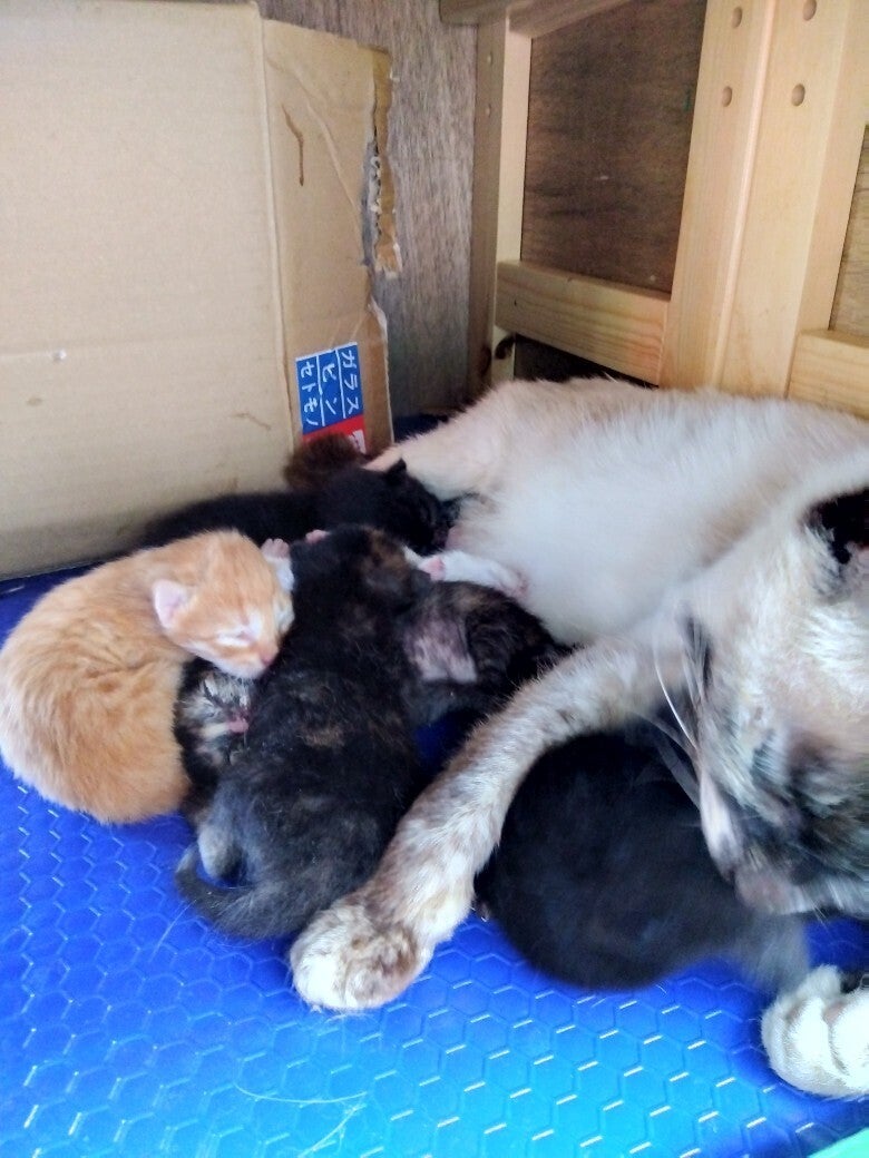 4月28日に、シャムが出産しました。島にゃんハイツ2階にて子育て開始しました。部屋の奥に置いてあるダンボールの中に、黒っぽい子や真っ白な子、茶トラもいて可愛いです。5月9日、移動しました。猫は子育て中、何回か住処を変えます。今回は、道路向かいの下の薮の中みたいな所になりました。シャムが2~3匹運んで授乳開始して、残りの子を、黒猫のハナがくわえて運んで行きました。ハナは以前から、他の猫の子の世話をしてきた母性の強い猫です。そして何故か、シャムを含む3匹の猫が囲んだ中に子猫たちはいて、オッパイ飲んでいて、囲んでいたミュウも授乳しめいました。ミュウも産んだのでしょうか?見辛い場所で確認できません。以上、子育て報告でした(*´ `*)---------------amazonほしい物リストhttps://www.amazon.jp/hz/wishlist/ls/1TXZBIZDWYPO9?ref_=wl_share---------------Instagramのアドレスhttps://www.instagram.com/shimanyan_kitchen