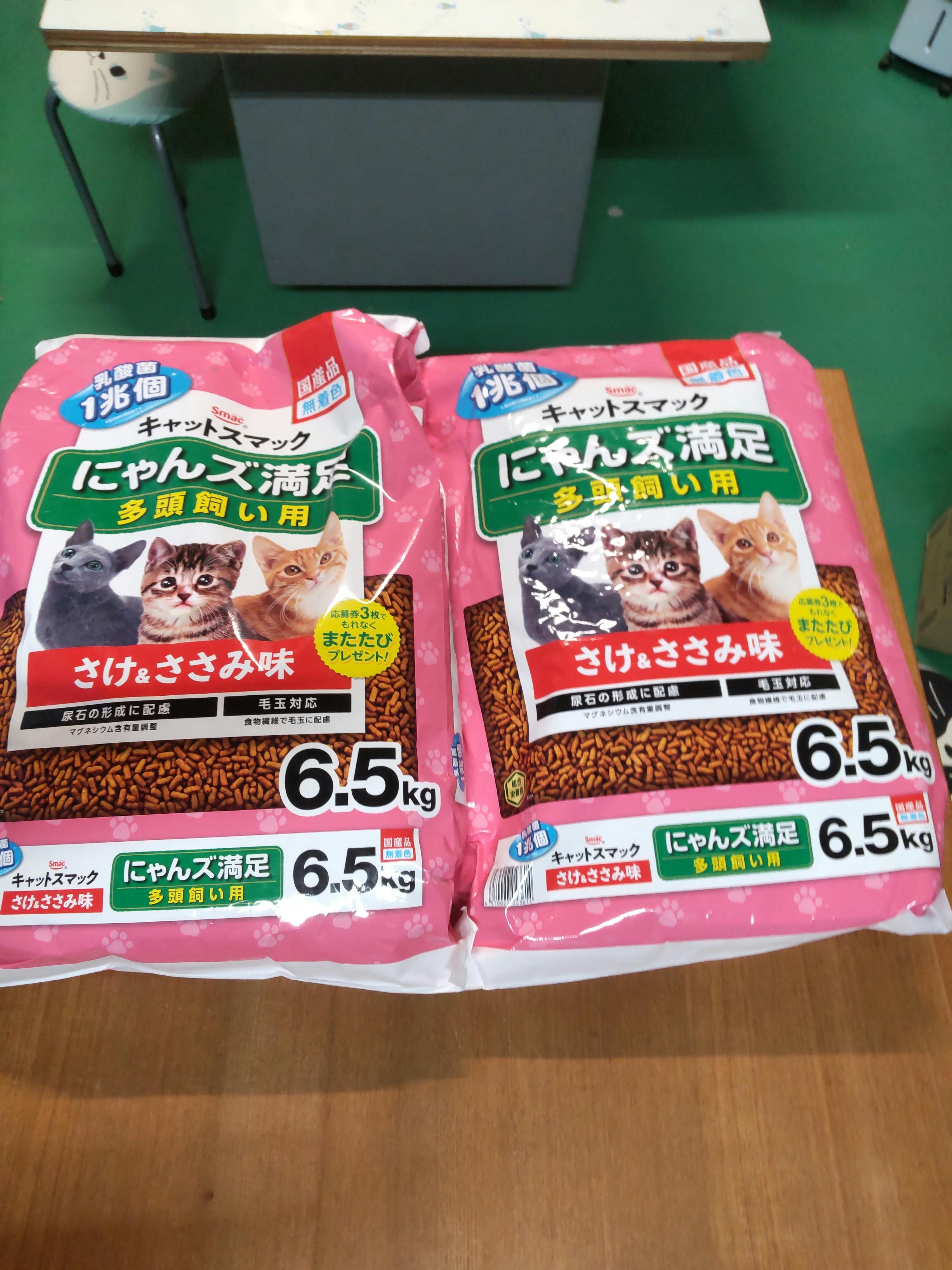 キャットフードが届きました!にゃんズ満足さけ&ささみ6.5kg×2M,T様、いつも有難うございます。お優しいメッセージも嬉しく拝見させて頂きました。8月まで11~12匹だった外の猫が、最近、次々に現れて21匹になり、ご飯タイムが賑やかになっています。野良生活が長かったコは協調性が低く、同じ皿で食べる他のコを叩いたり威嚇したりするので、度々、叱って諭します。繰り返す内に、我慢できるようになるコが出てきますので、気長に教えていこうと思います。 その為にもフードは、しょっちゅう入れておきます。奪わなくても食べられる安心感を与えるように。
