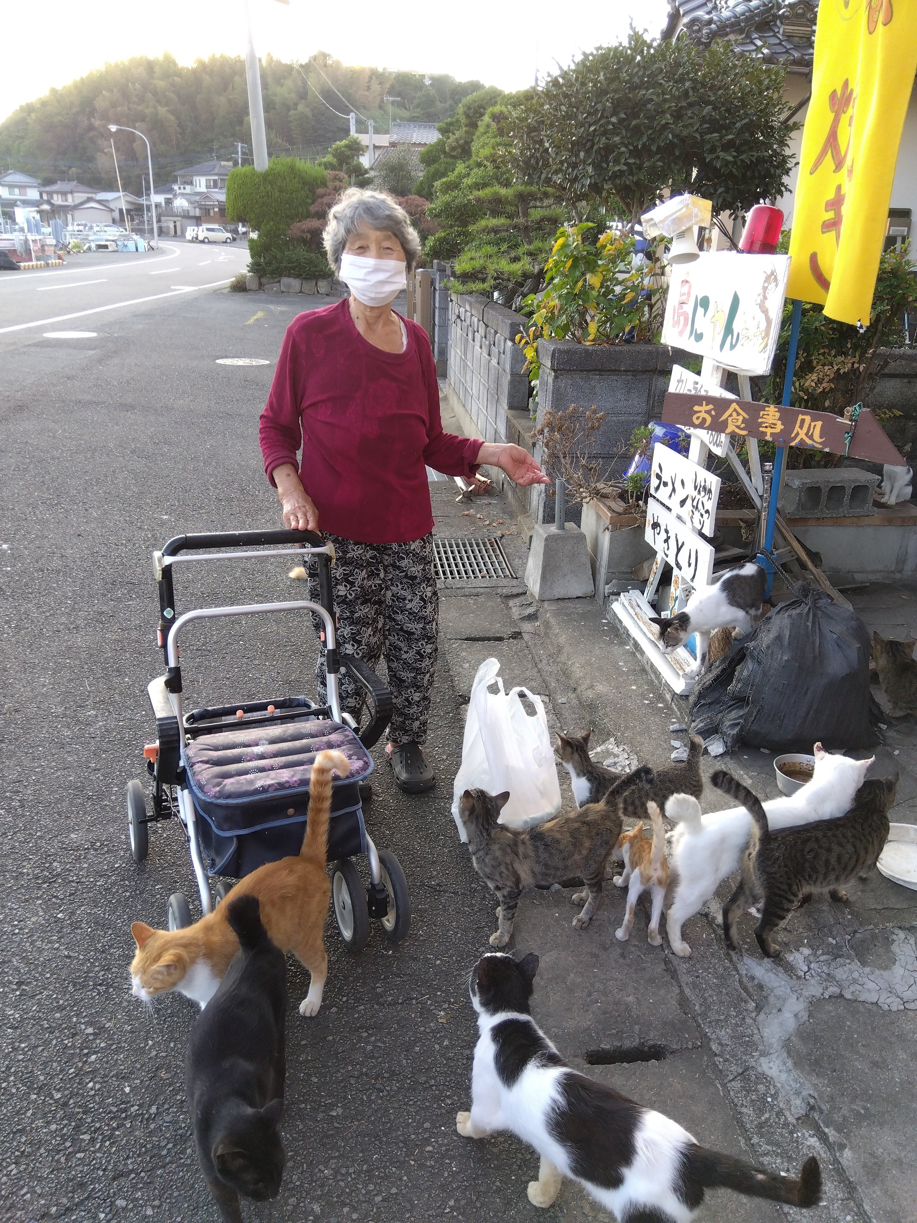 現在80歳過ぎで、毎日、押し車の中にキャットフードや手作りのご飯を入れて、島の猫達に配って回られています。