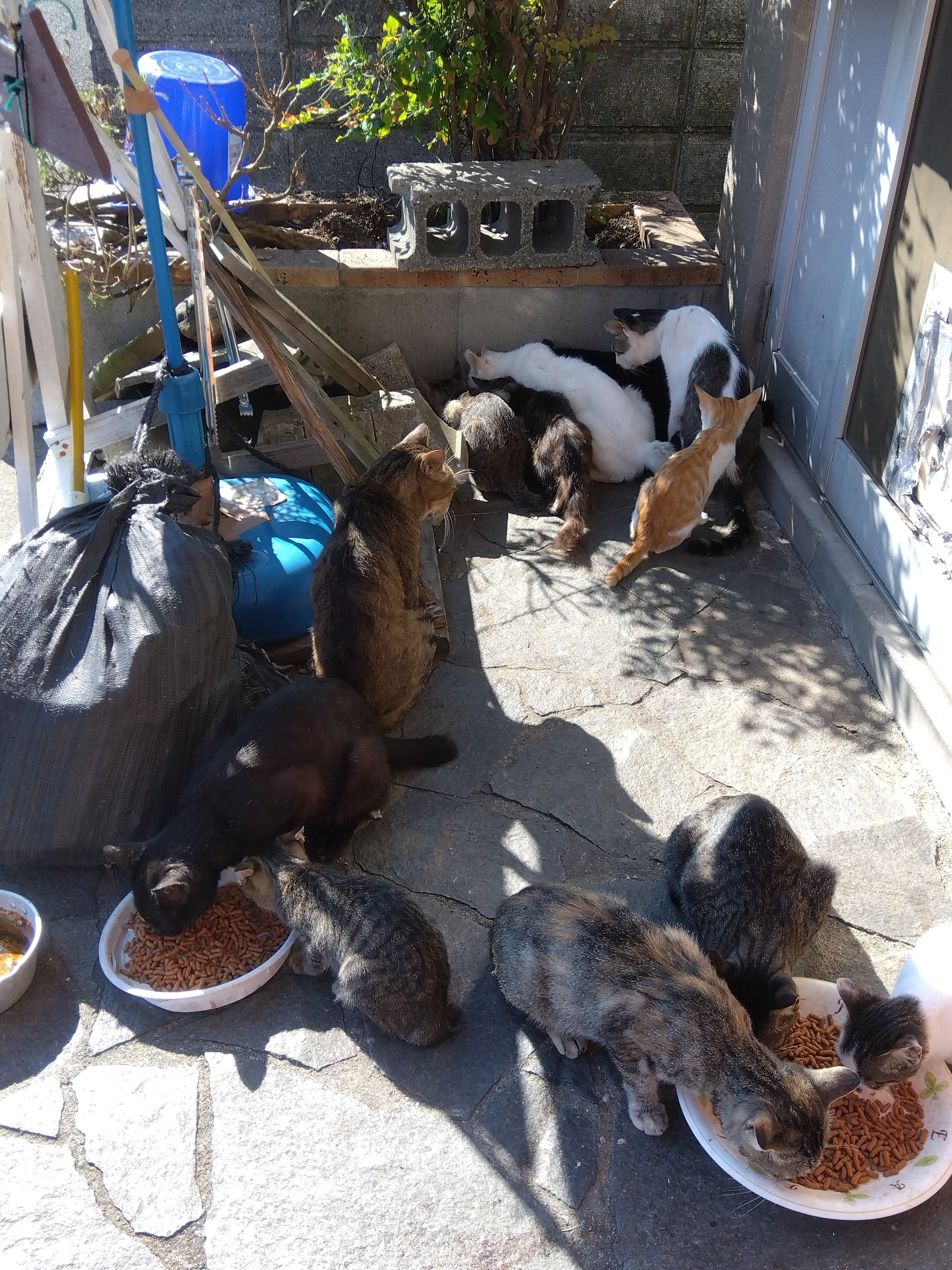 また、車にはねられて骨折した猫や、風邪に罹って鼻水垂らした猫が、うちを頼って来るので、キャットフードと水、サプリなどをあげています。骨折のコはほとんど動くことができないので、家の前に作って置いているダンボール小屋で療養したり、また冬の寒い時期には健康な猫達も寒さを凌ぐために小屋で寝ています。