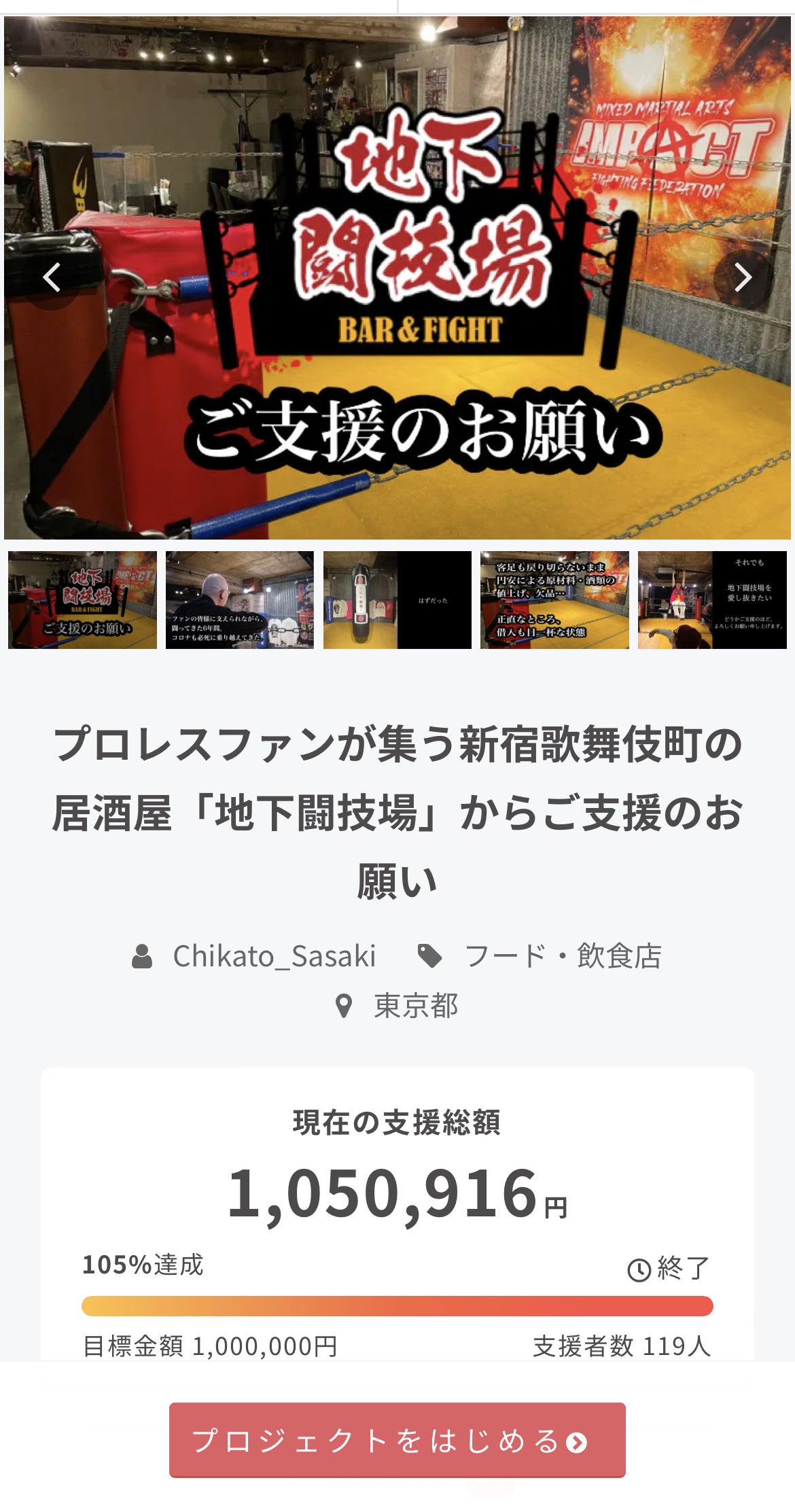 2023/01/01 01:22地下闘技場店主の佐々木です。おかげさまでプロジェクトも終了、目標も達成することができました。これも偏にご支援くださったみなさまのおかげです。本当にありがとうございました。この1ヶ月ちょっとの間いろんなことを思いましたが、一番感じたのは『みなさまに応援されてるな』ということでした。自分の好きで始めた店をこんなにも応援してくれる方がたくさんいて自分は幸せだなと改めて感じてます。本当にありがとうございました。まだまだこの先も険しいとは思いますががんばってやっていきます。今後とも地下闘技場を応援よろしくお願い致します。※画像は目標達成したプロジェクトトップページ。本当にありがとうございました。 もっと見る