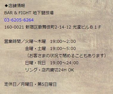 新宿歌舞伎町の裏路地で6年、美味しい料理と迫力のあるイベントを売りに、たくさんのお客様に支えられて営業してまいりました。プロレス・格闘技以外にも、日本酒会、ディスコイベントなど個性的なイベントを開催し、皆様に楽しんでいただきたい一心で営業しております。