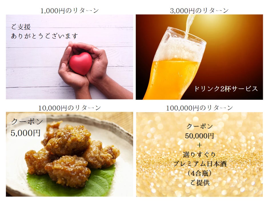ご支援をいただいた方へは、真心を込めてお礼のメッセージをお送りいたします。ご支援金額により、お会計クーポンなどを提供させていただきます。詳しくは、以下をご覧ください。