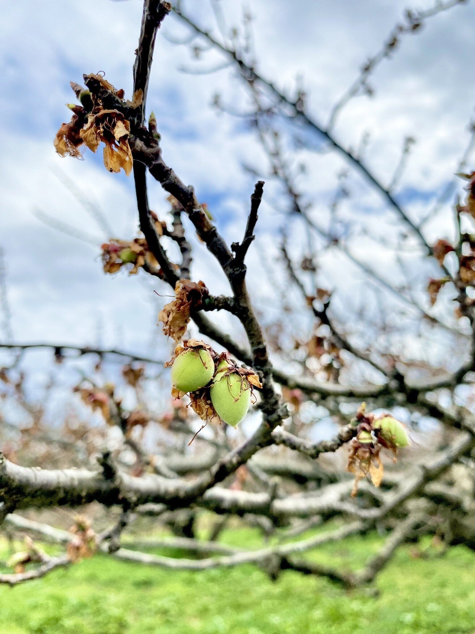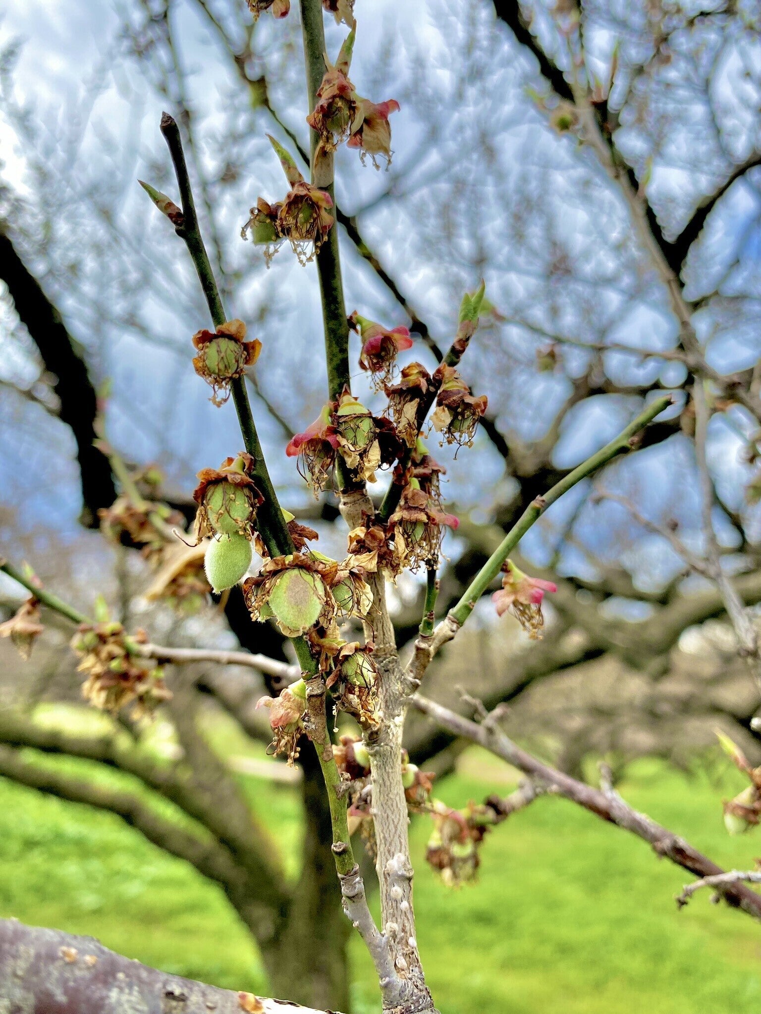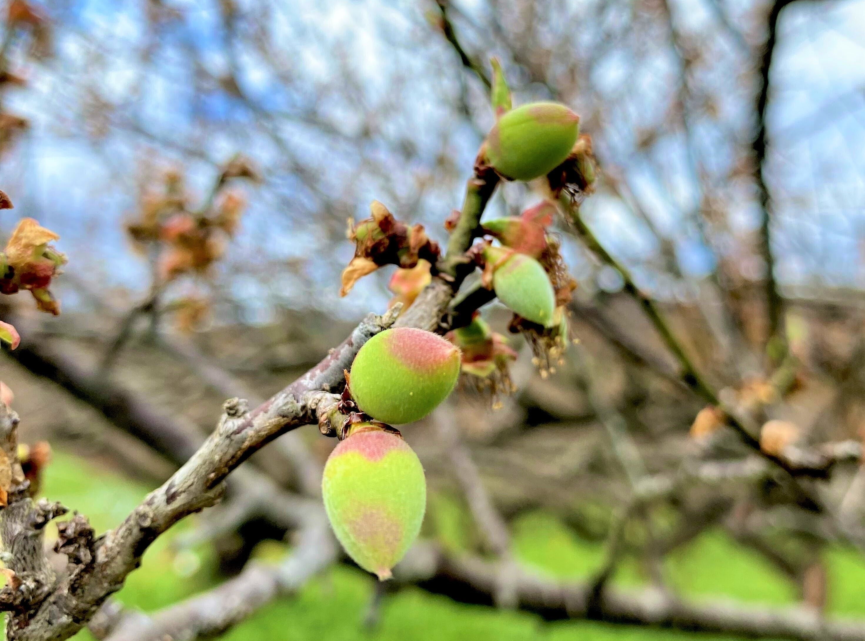 3月上旬まで梅の花で満開だった木に、今回のレポートではウメの実の赤ちゃんが
