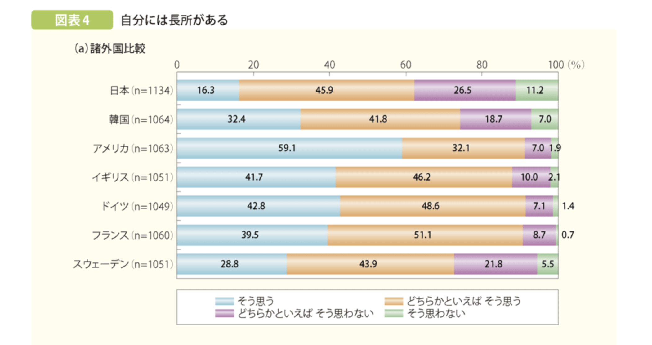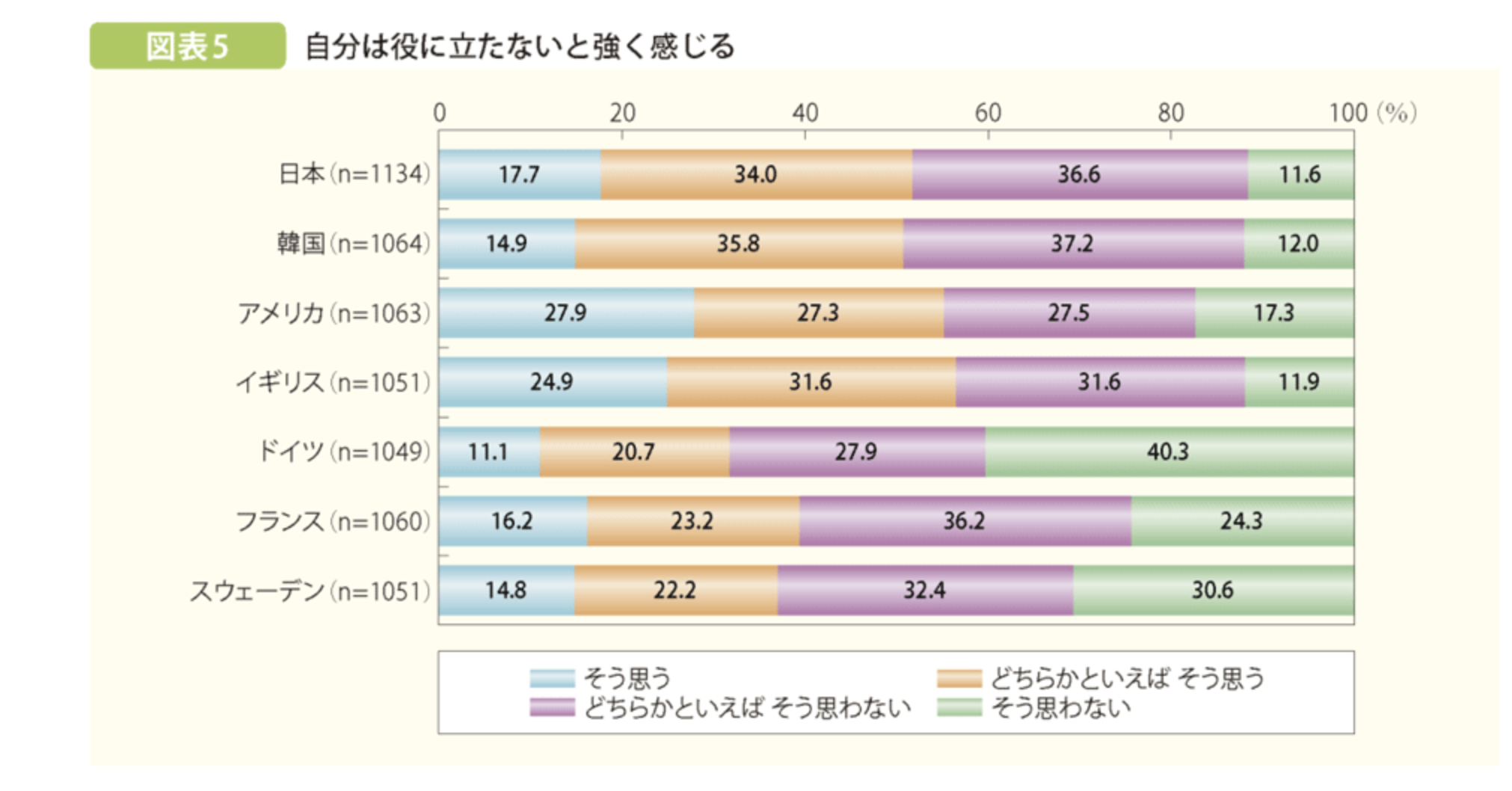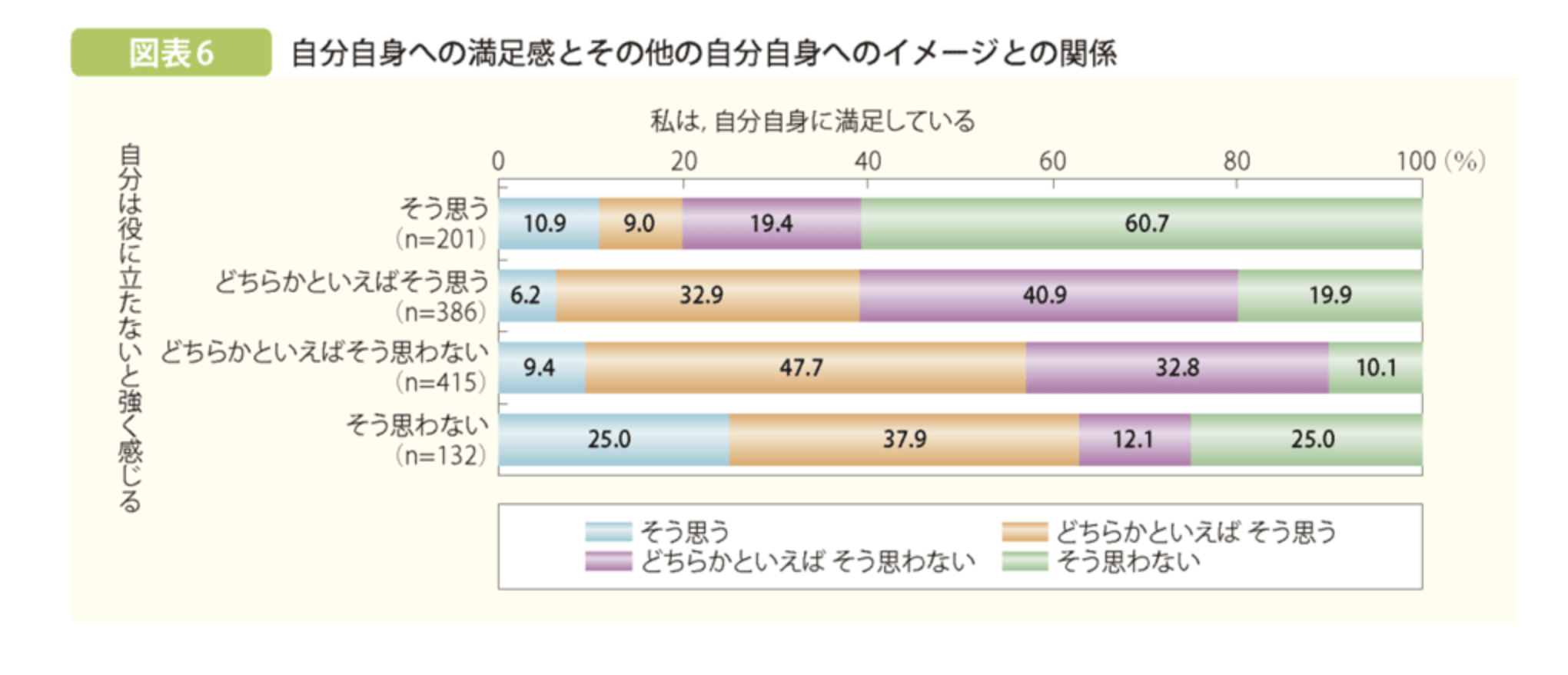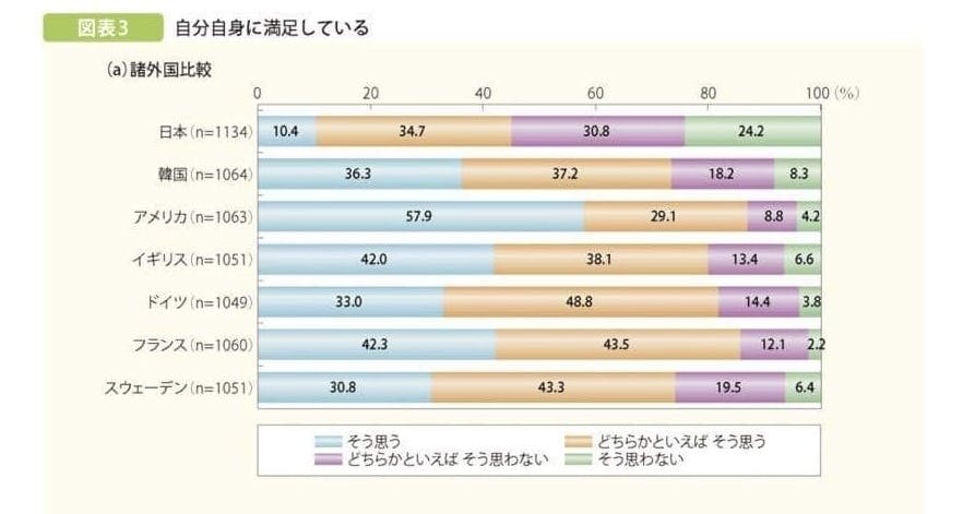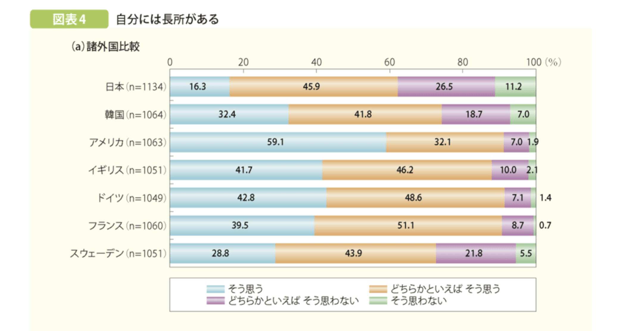 日本の若者は「自分は役立たないと感じる」と回答した人ほど、「自分自身に満足している」と答えた割合が低く、同様の関係性は諸外国にはみられなかったのです。