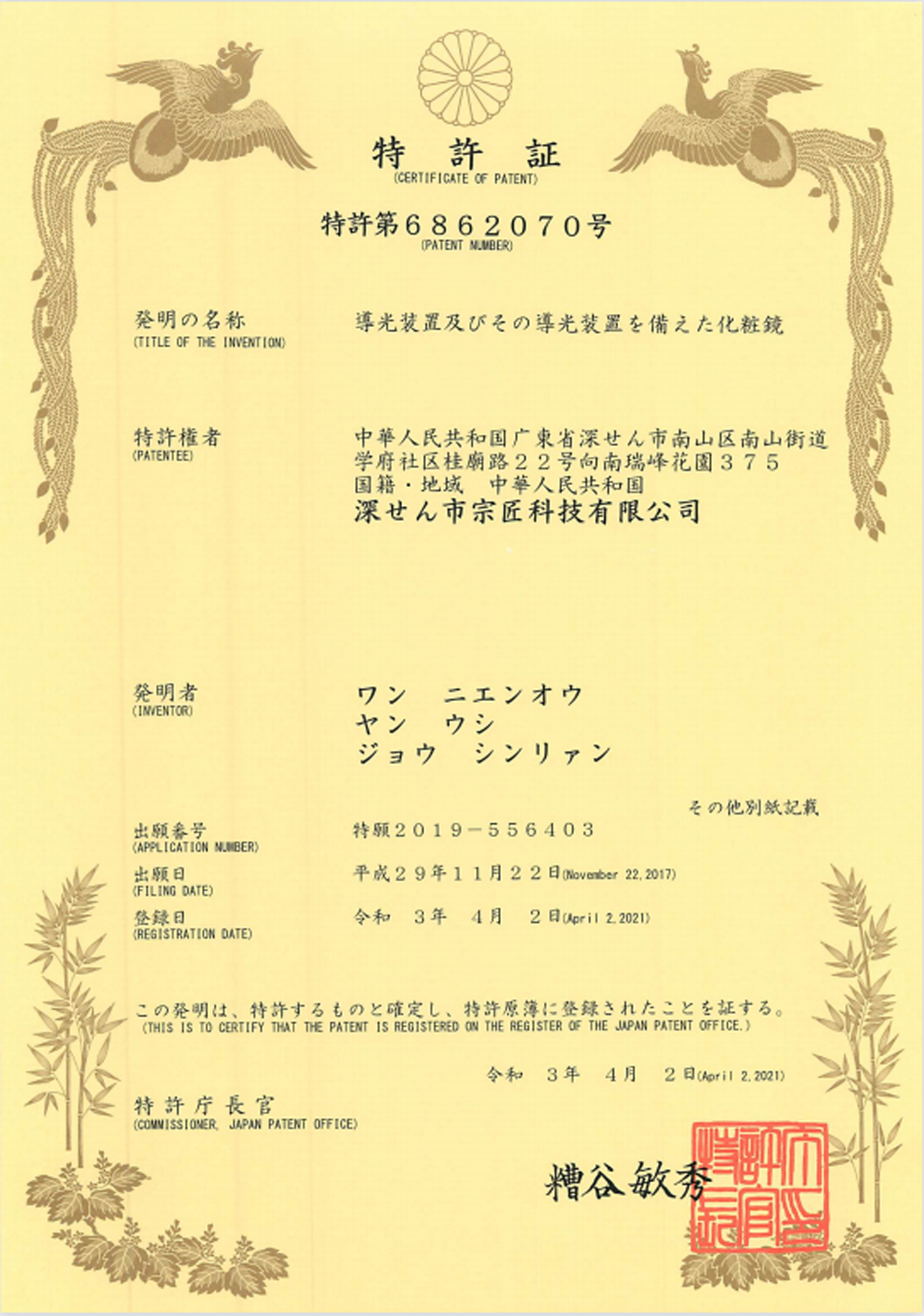 特許証を取得しております。