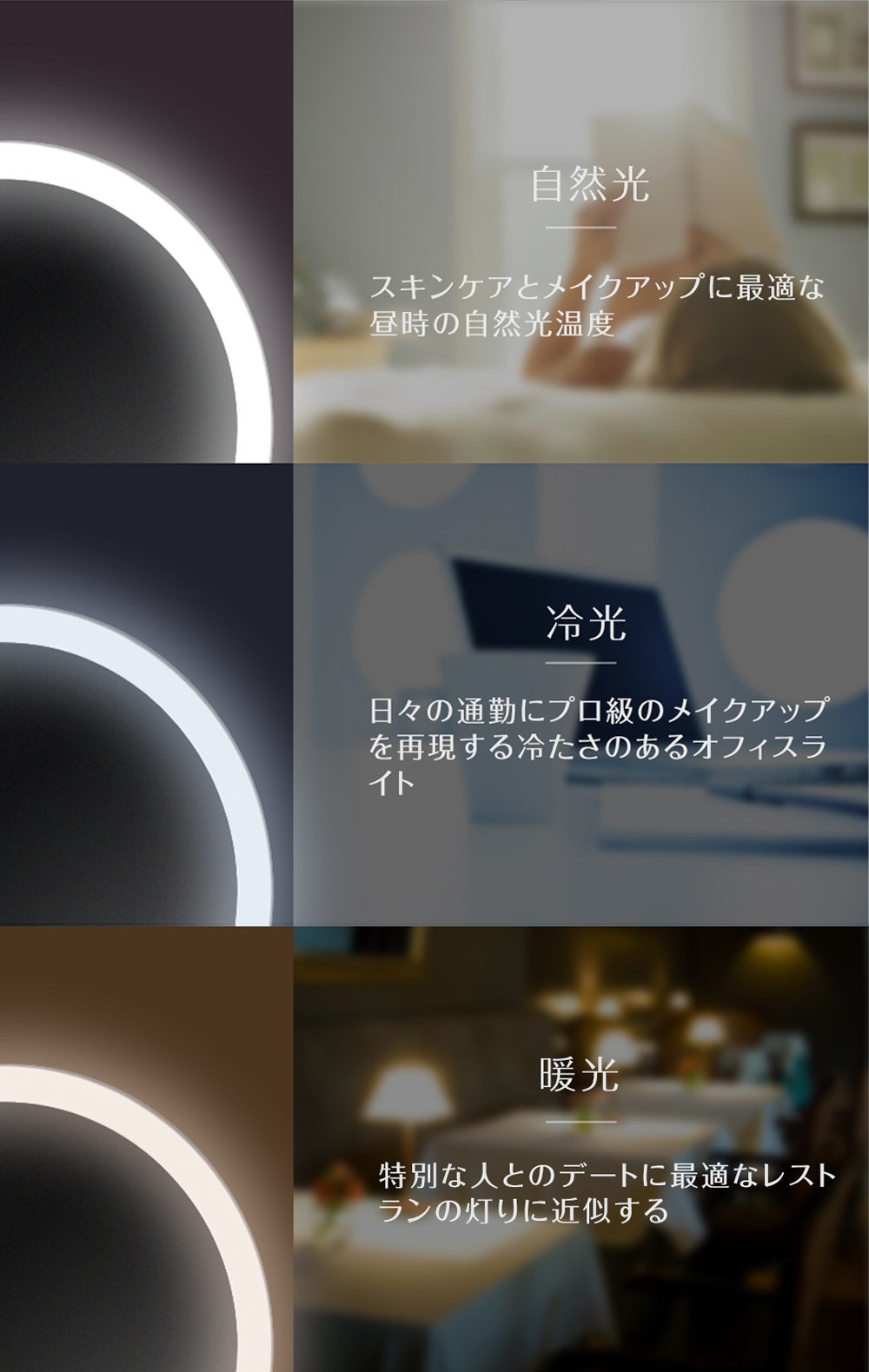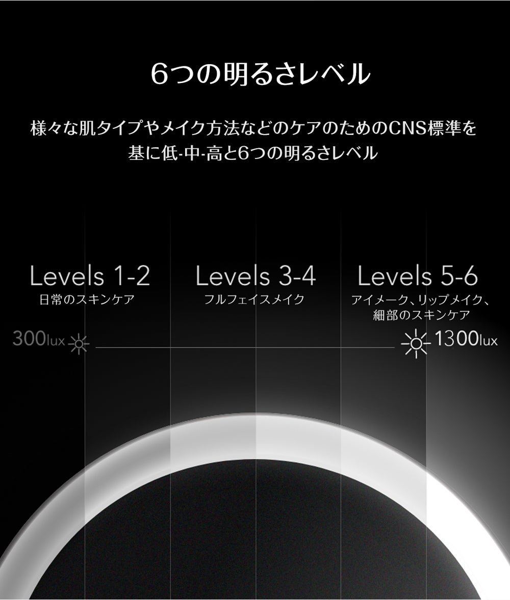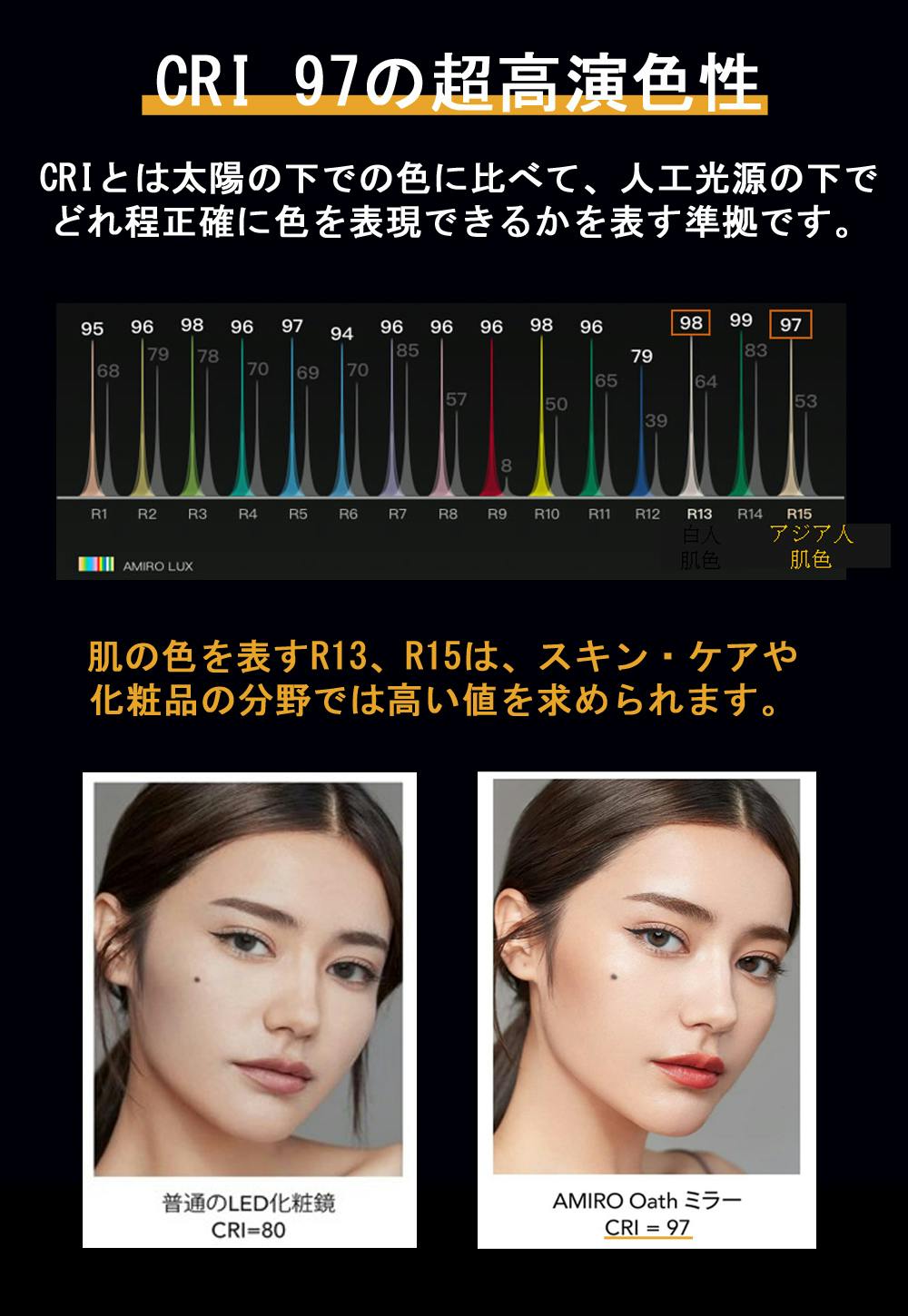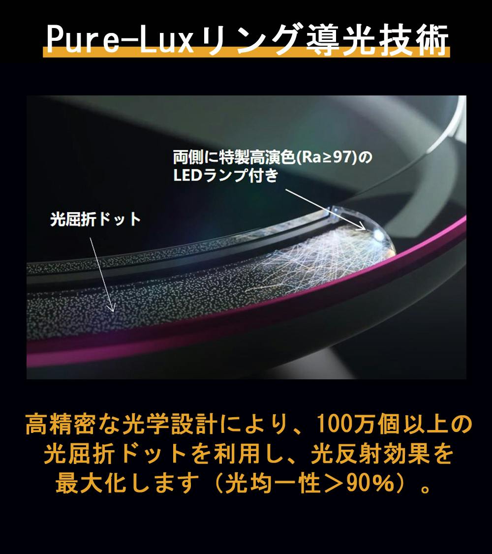 特許取得のPure-Lux光伝導技術によって、100万個以上の光屈折ドットから作られた導光リングで、影なく化粧ムラ防止!「3種類の色温度×明るさ6段階」時間帯やお好みに合わせて、18パータン調整可能!銀メッキ・フロートガラス鏡面を使用し、CRI 97超高演色性。アジア人肌調子や化粧の姿をリアルに伝えられます。
