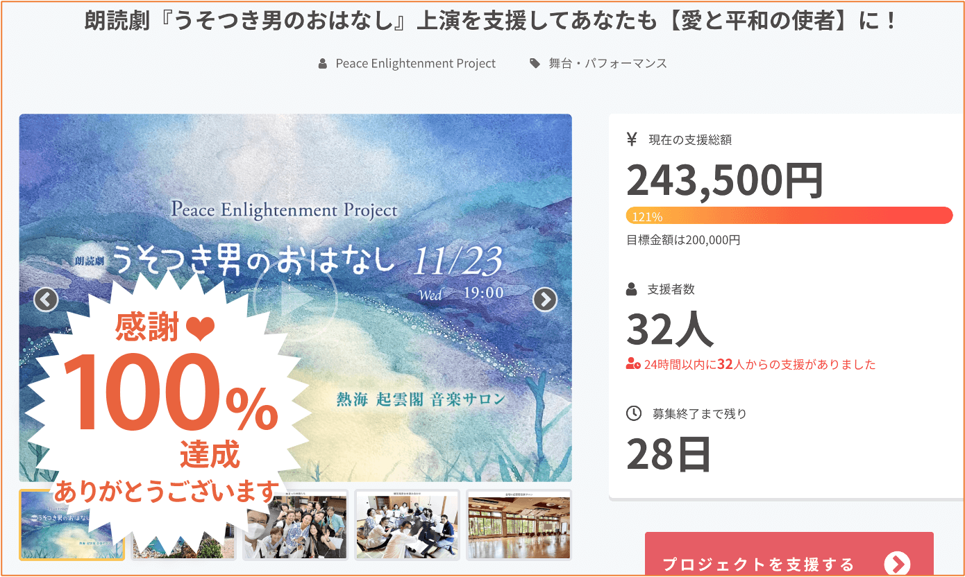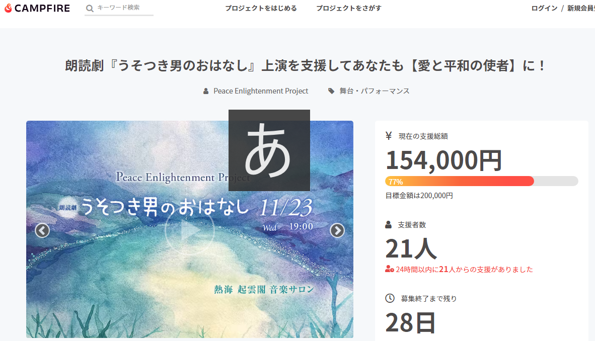 起雲閣・音楽サロンにて、嵐のような雨にも関わらず51名ものお客様にご来場いただき朗読劇『うそつき男のおはなし』を上演しました。「青い光の珠のひみつ」を知った人は、嘘がつけなくなり出会う人みんな家族だと思うようになる。朗読劇ではあるけれど出演者の想いが、声として現れ場のエネルギーがうまれ、ただの朗読劇を超えた世界へと誘われました。原作・脚本のジョルジュ百合子先生、演出された渡辺克己さん出演者みんなで創り上げた『うそつき男のおはなし』の世界をぜひ再び味わっていただきたく音声データアーカイブを作成します。CAMP FIREでお申し込みいただけるのも、残り2日、ぜひ多くの方にこの体験をお勧めしてください。ラストスパートをよろしくお願いいたします。Peace Enlightenment Project 実行委員会@感謝