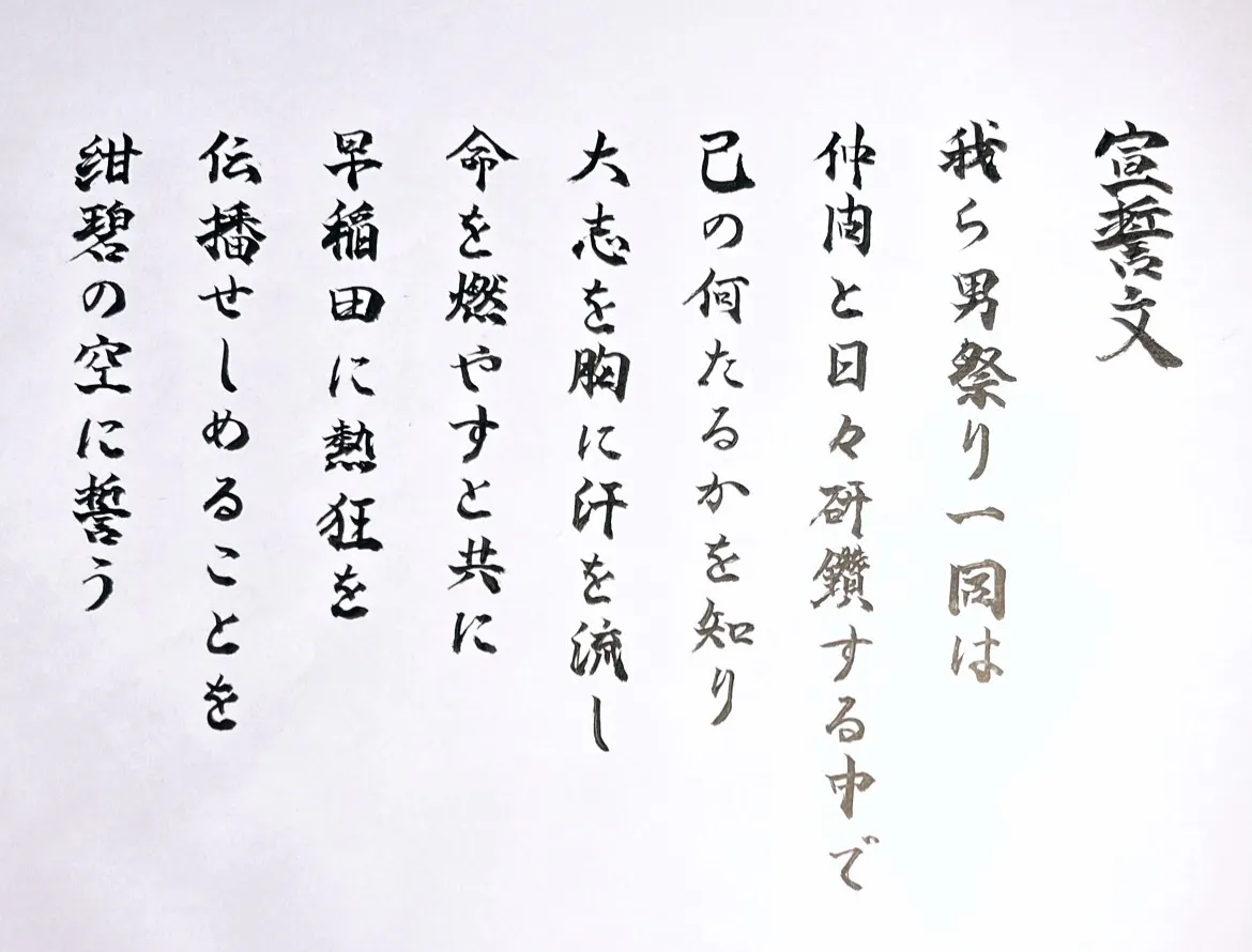活動を通して演者、クルー自身がどうあるべきか、そして早稲田祭までの活動を通して男祭り2022として成し遂げたい目標を明文化したものがこの宣誓文です。