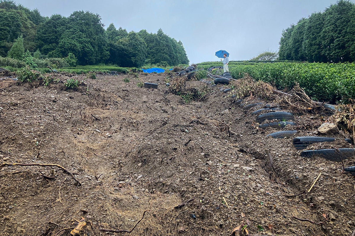 土砂にのまれた茶畑と茶の間、崖崩れた茶畑。